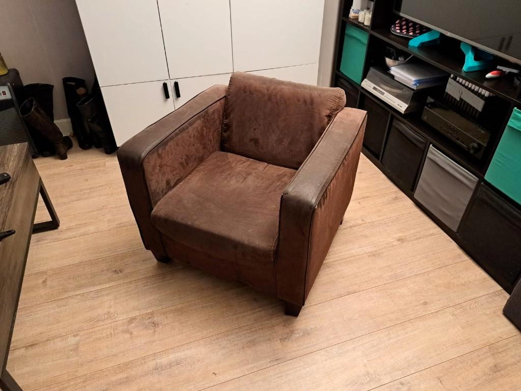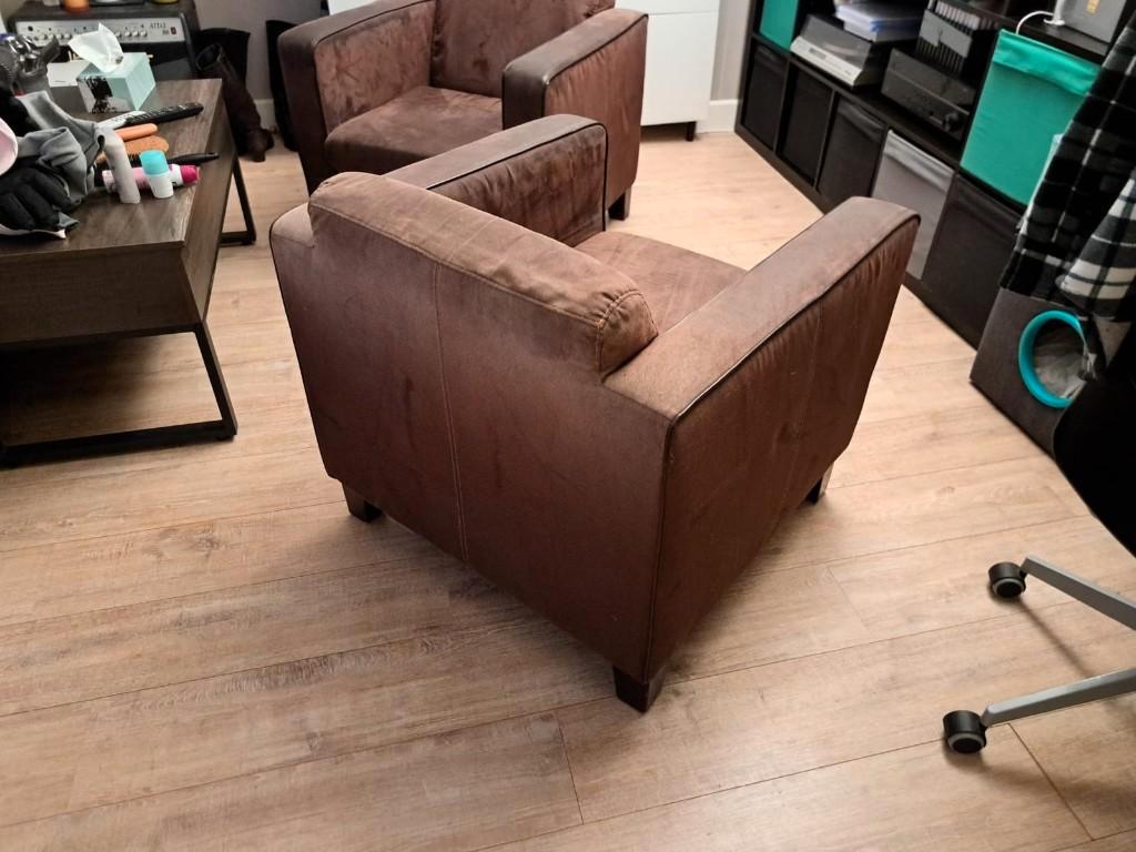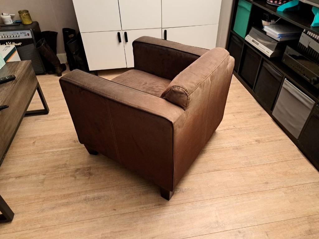 Te koop: twee comfortabele bruine fauteuils in goede staat. De stoelen hebben een tijdloze uitstraling en passen goed in een woonkamer, studeerkamer of kantoor. Ze zitten stevig en comfortabel en hebb