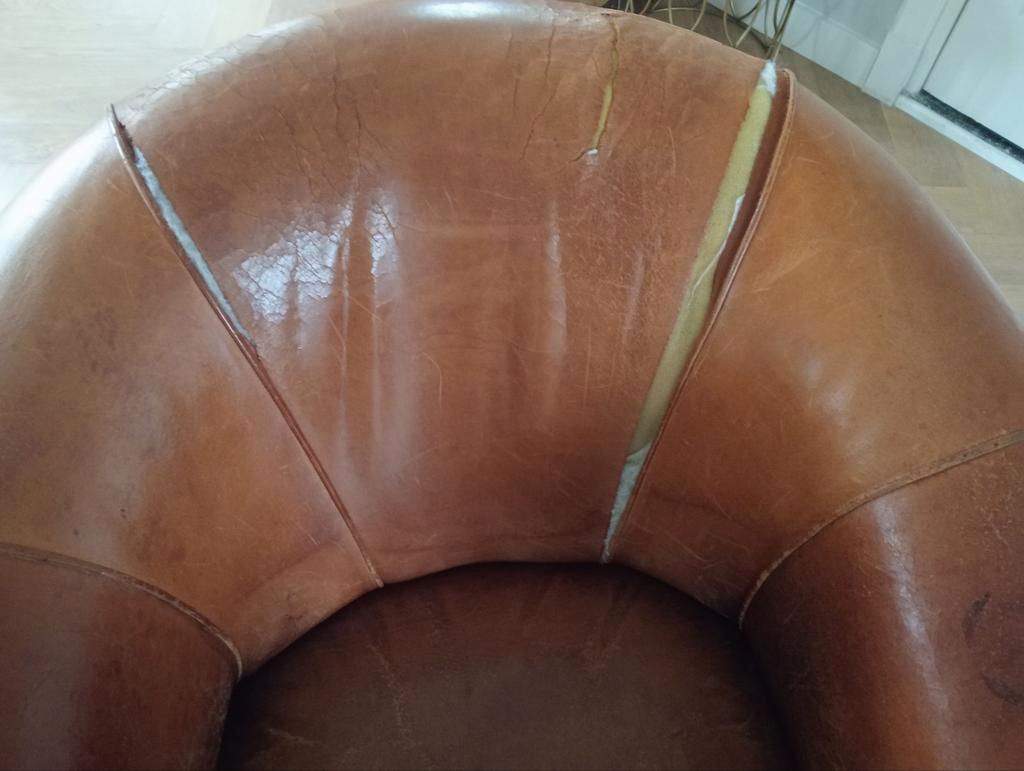 Mooie oude en robuuste leren stoel. Met schade aan het ruggedeelte ( zie foto)