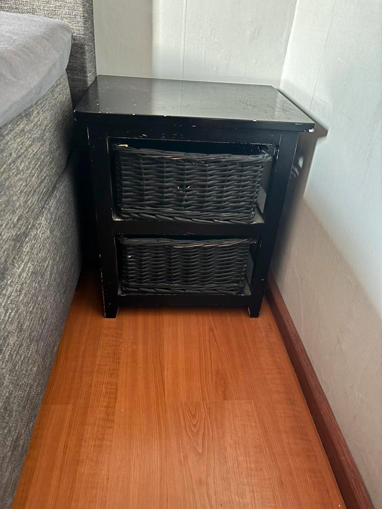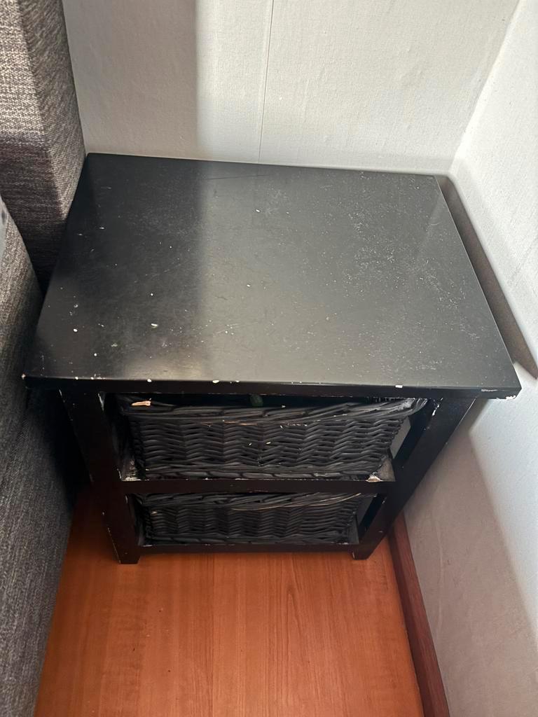 Nachtkastje gratis af te halen (wel zelf even schoonmaken) na 14 maart zwart hout met 2 zwart riet houten manden. Maten: 47cm breed, 37cm diep en 55cm hoog