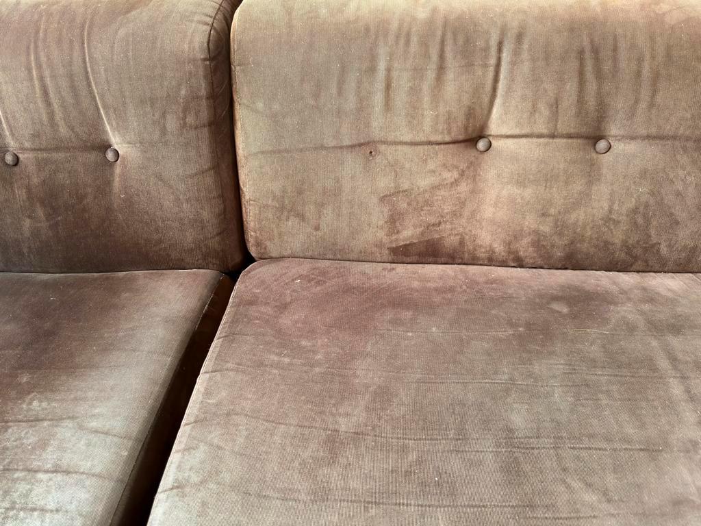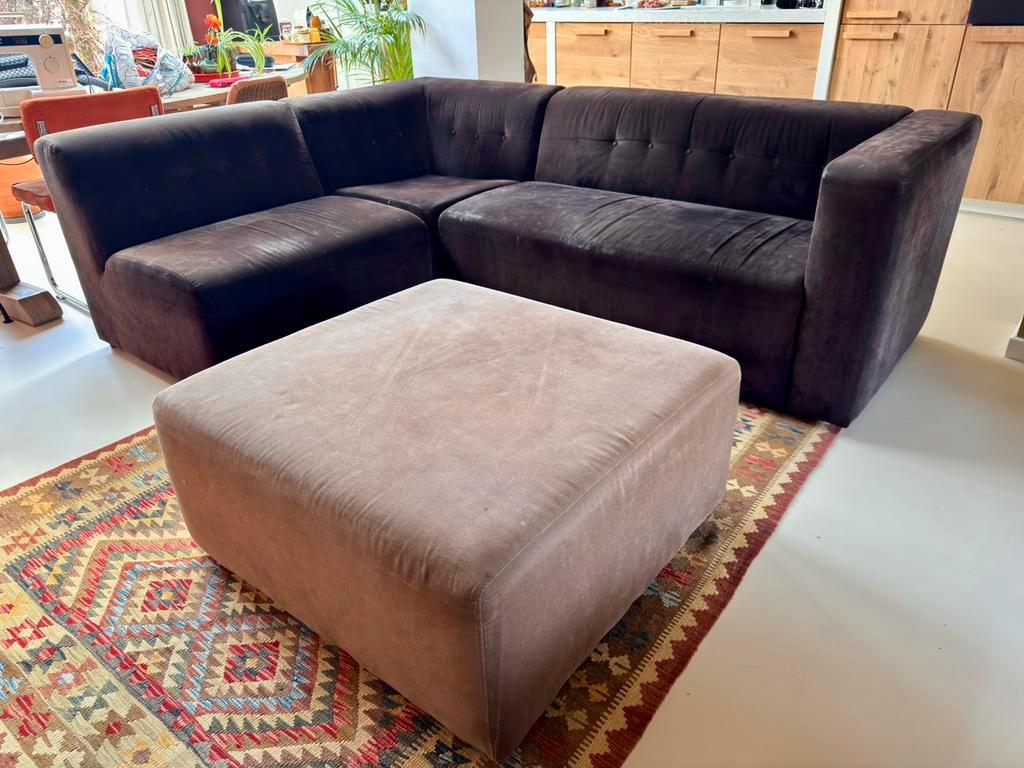 Gratis af te halen: ruime en comfortabele hoekbank met bijpassende poef. De bank zit nog fijn en is stevig, ideaal voor wie een extra zitplek zoekt of een bank wil hergebruiken. De bank heeft enkele s