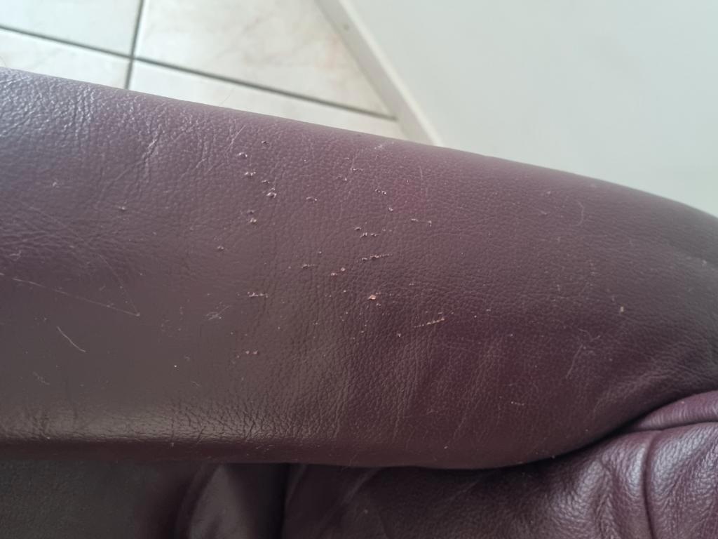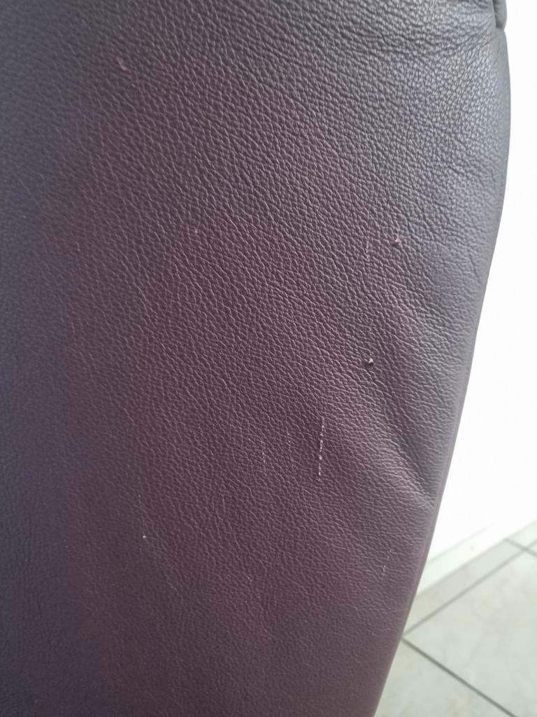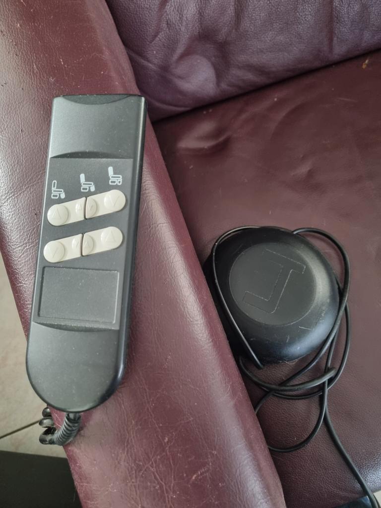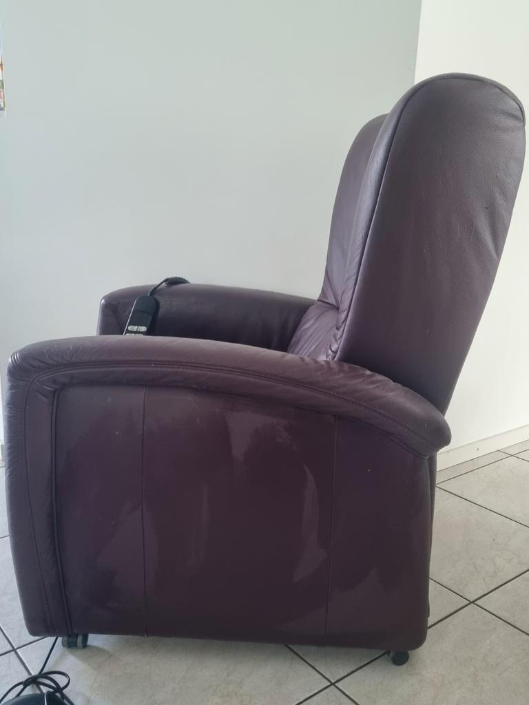 Elektrische relaxfauteuil, kleur aubergine, echt leer, met krassen van kat. Afmeting h 100, b 72x78, zithoogte 42. Opruimen huis overleden moeder.