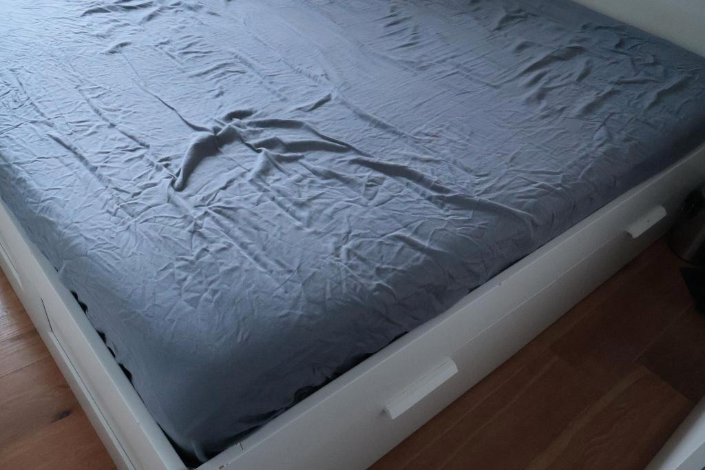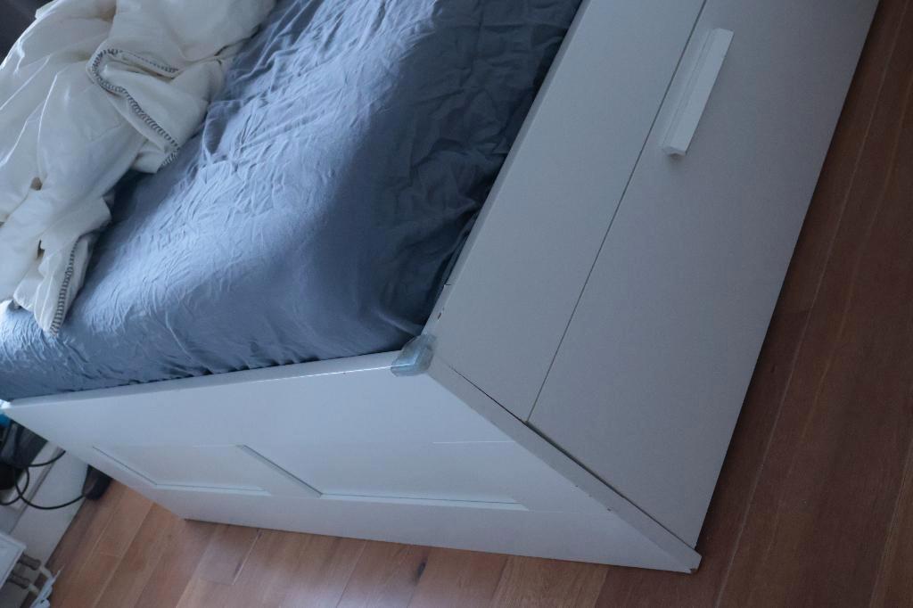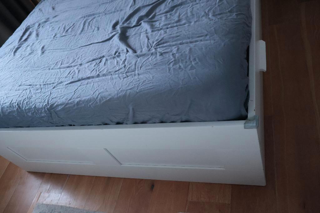 Product: ikea brimnes bedframe, 160 cm breed. Belangrijk: alleen bedframe, exclusief matras. Kenmerken: inclusief 4 grote lades met veel opbergruimte. Staat: gebruikt, met duidelijke gebruikssporen/sl