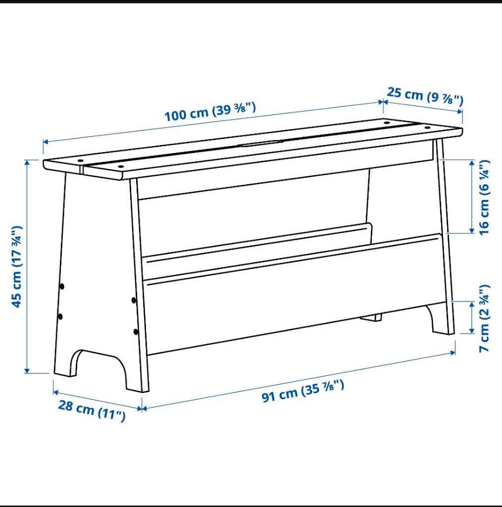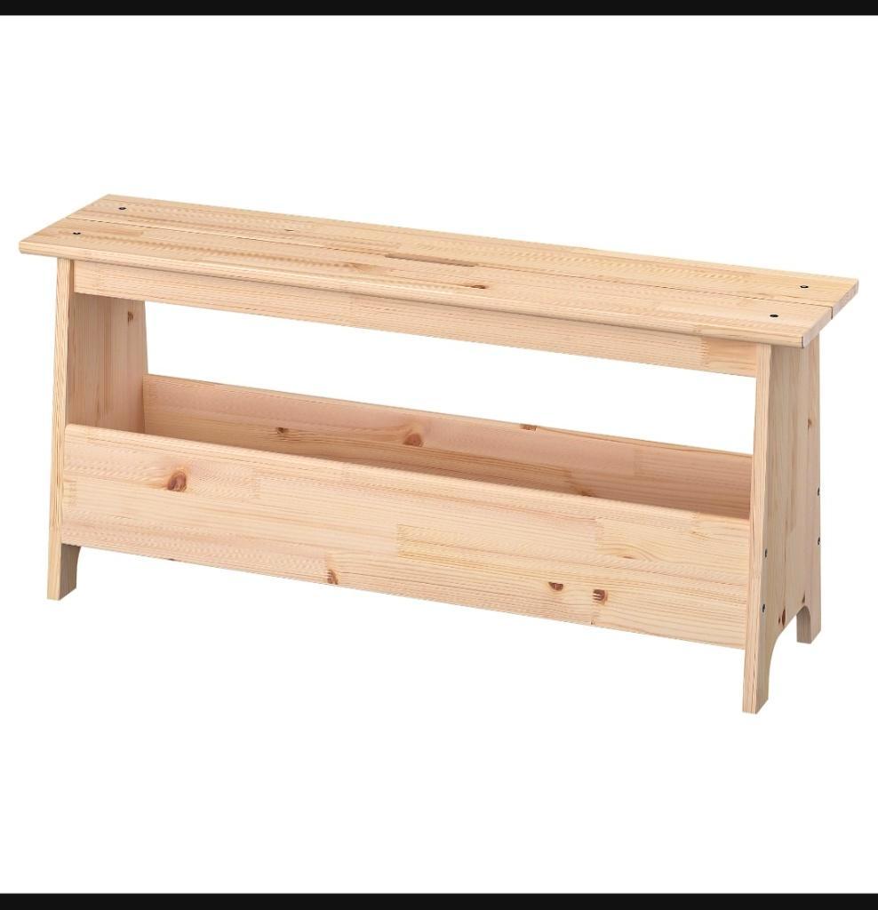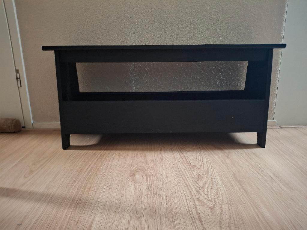 Houten bankje van ikea (100x28cm) met fijne opbergruimte. Grenen bankje destijds zwart geverfd en kleine inkeping gemaakt zodat bankje over plint heen valt. Gaat weg in verband met verhuizing. Mag gra