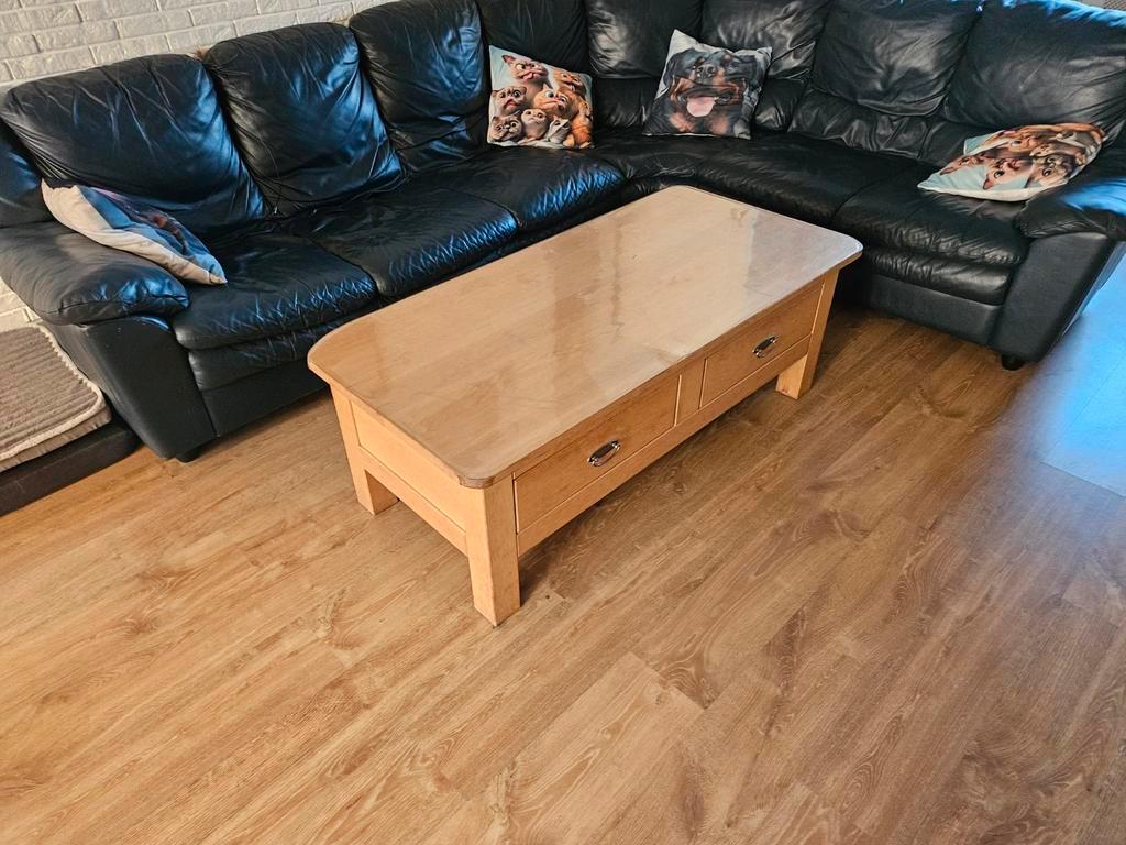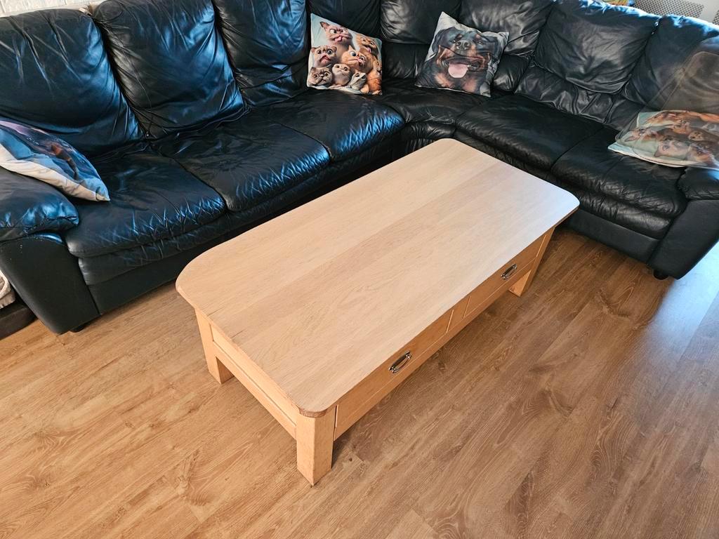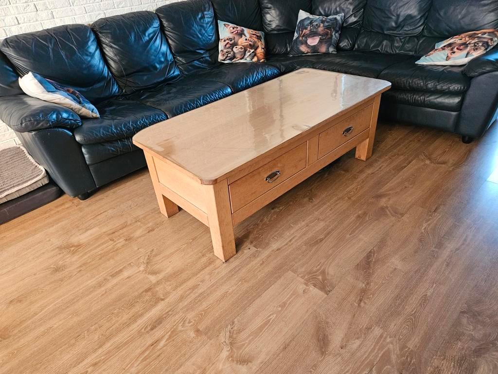 Mooie houten salontafel. De tafel is in gebruikte staat en heeft een rechthoekige vorm. Ideaal voor in de woonkamer. Het materiaal is waarschijnlijk eikenhout. De hoekjes zijn rond afgezakt omdat deze