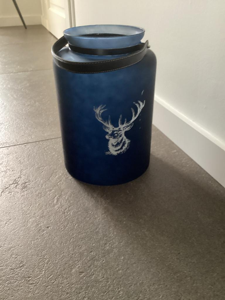 Prachtige blauwe glazen vaas met een unieke herten afbeelding. Deze vaas is een echte blikvanger en perfect voor het tentoonstellen van bloemen of als decoratief object. De vaas is in goede staat en k