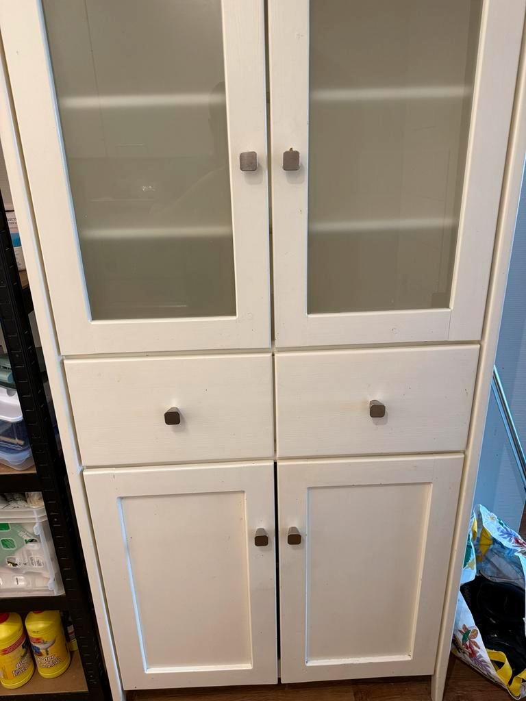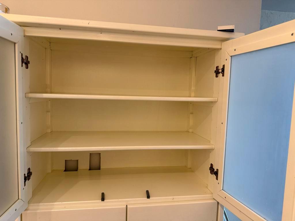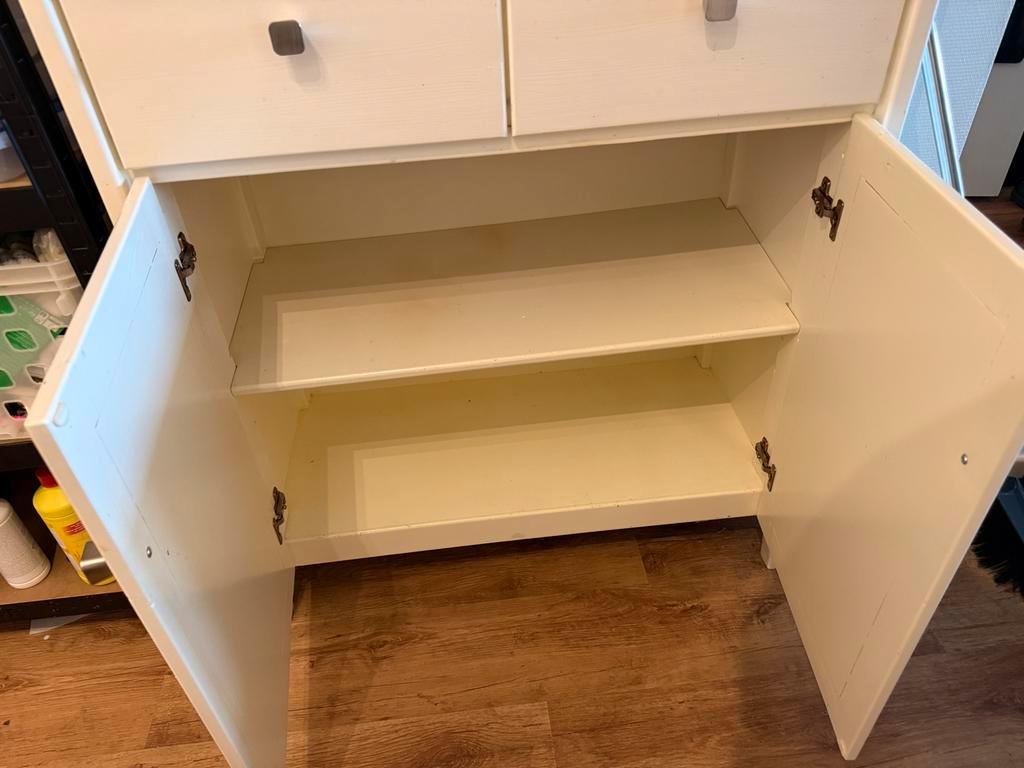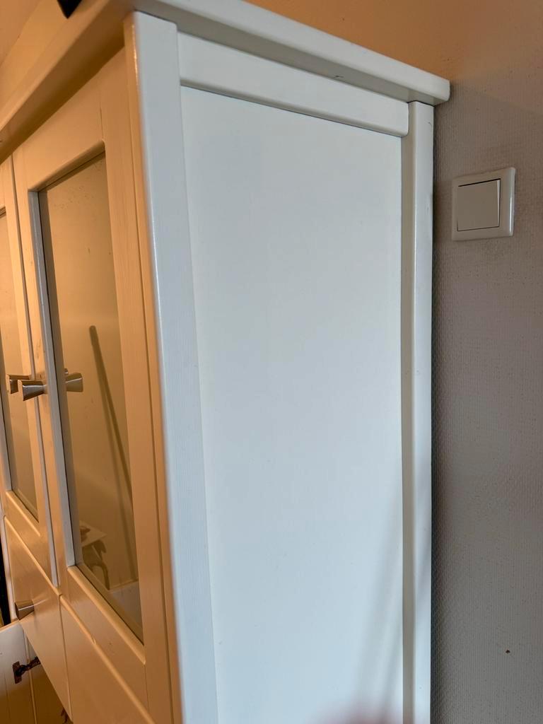 Prachtige, handgemaakte witte houten kast. De kast is in goede staat en heeft de volgende afmetingen: hoogte 182,5 cm, breedte 90 cm en diepte 42 cm. Ideaal voor extra opbergruimte in de woonkamer, sl