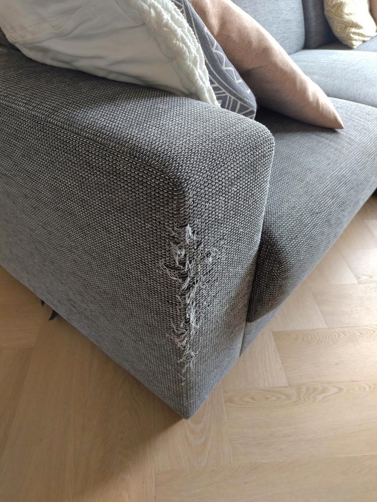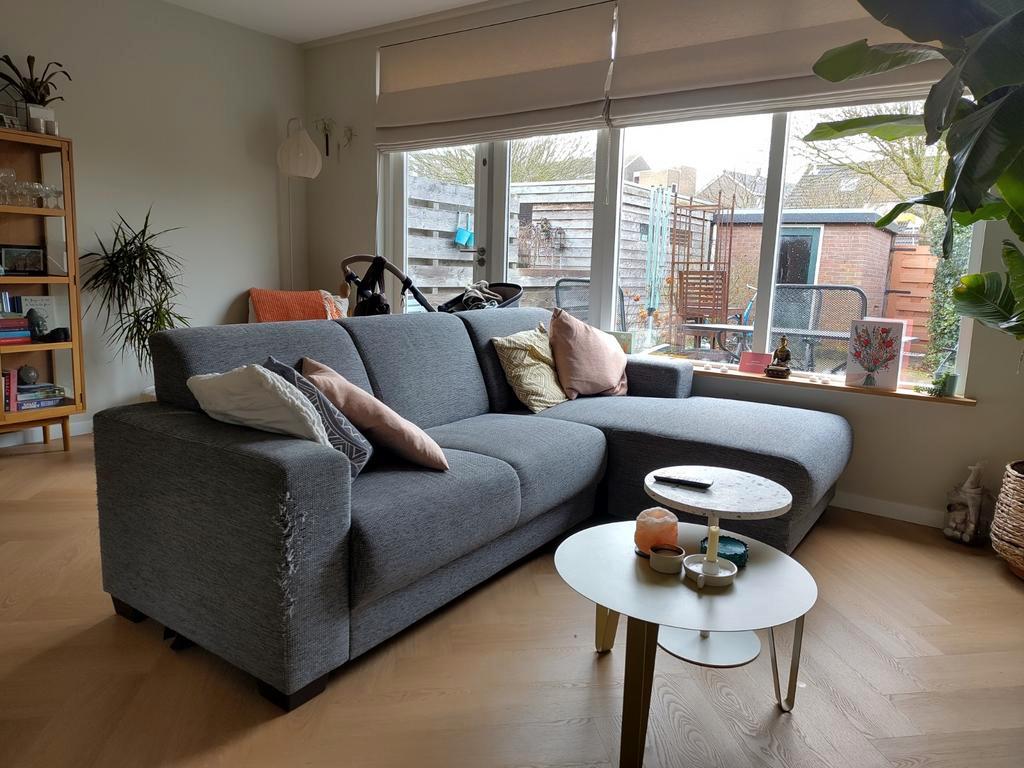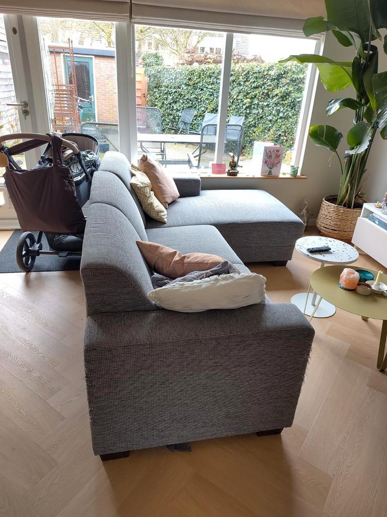 Comfortabele grijze hoekbank. Ideaal voor een gezellige zithoek. De bank is gebruikt en de kat heeft zich helaas uitgeleefd op van de 2 hoeken. Lengte 237 breedte 83 chaise longue 150 hoogte 43