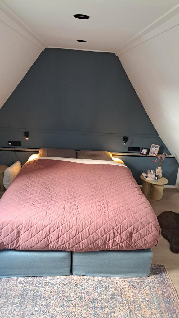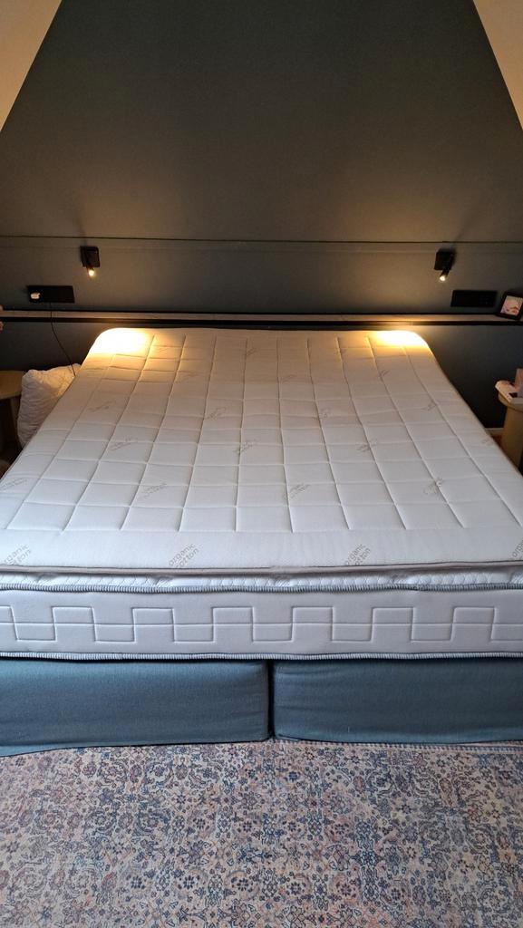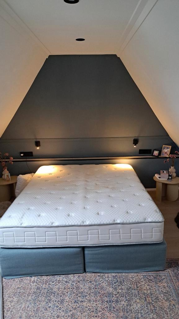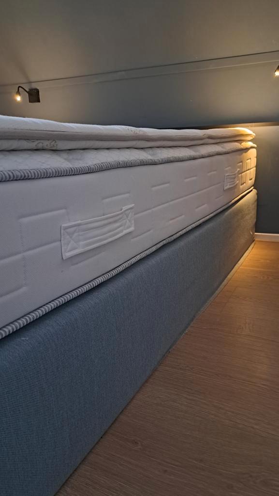 Boxspring van 160 cm breed en 200 cm lang. Ideaal voor een studentenkamer, logeerkamer o.i.d. In gebruikte staat. Inclusief topper en bijpassende overtrek. Graag uiterlijk deze week ophalen.