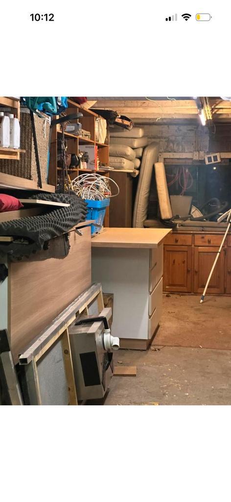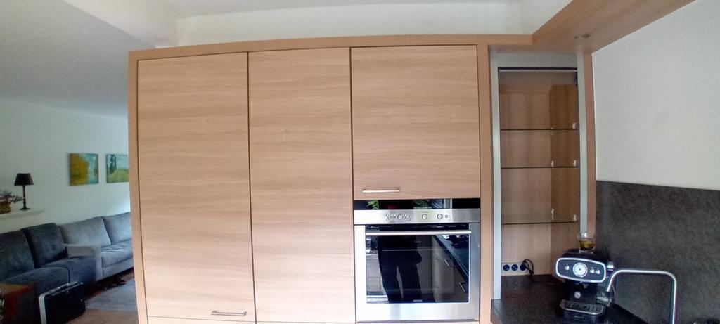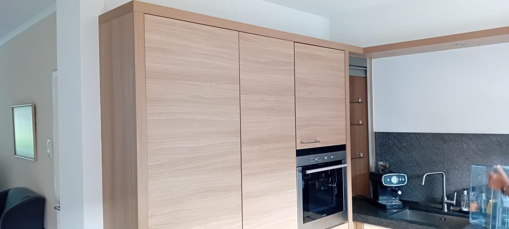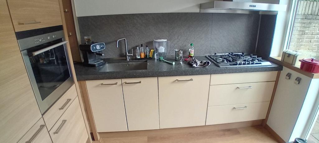Mooie keuken. Het blad is van graniet en de wandtegels zitten erbij. Inbouw oven en koelkast/vriezer. Er zit ook een eiland bij lastig op de foto te zien, zie laatste foto van de schuur. Kastjes zijn