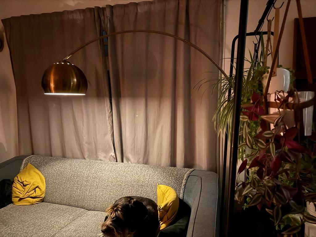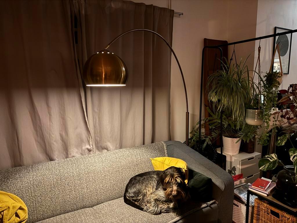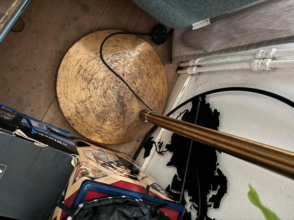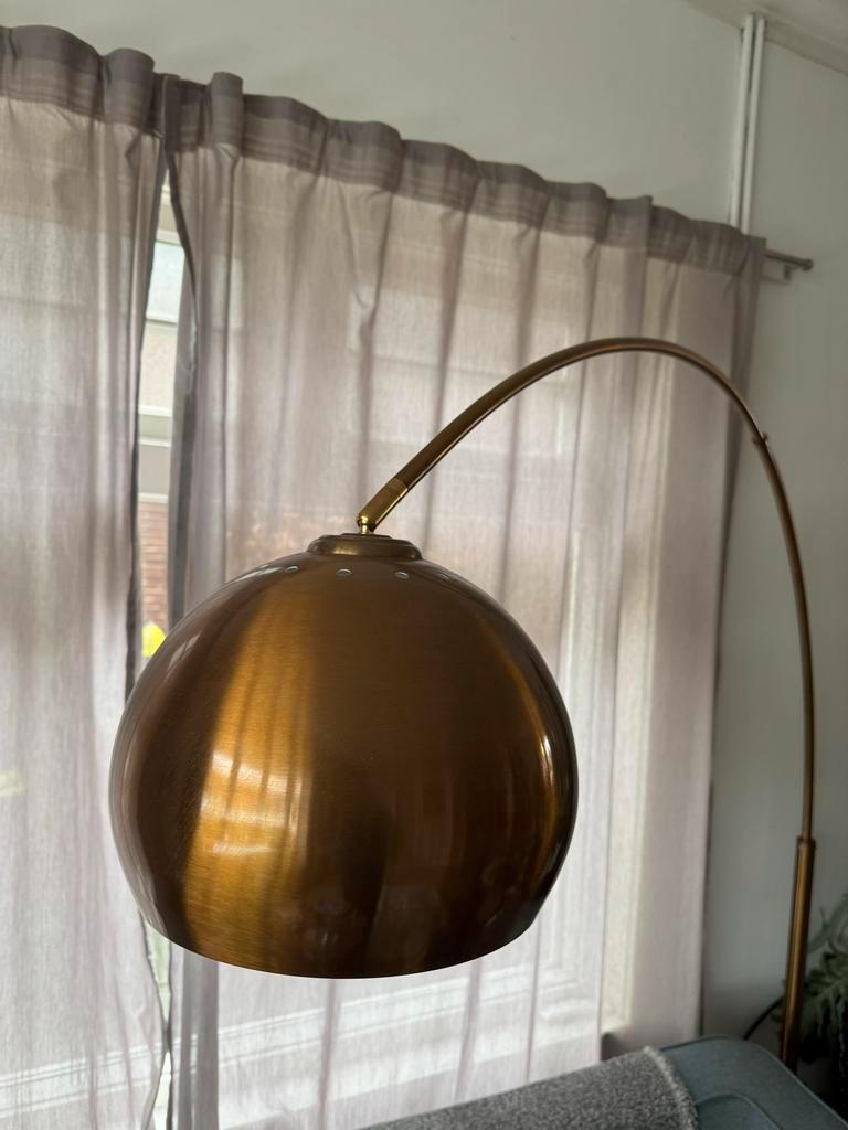 Gratis af te halen: koperkleurige booglamp. De lamp heeft beschadigingen (vooral aan de voet), maar de voet stond bij ons niet in het zicht. De lamp geeft - zoals te zien op de foto’s - een sfeervol l