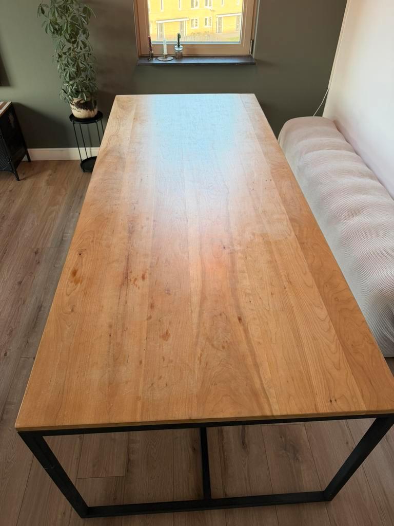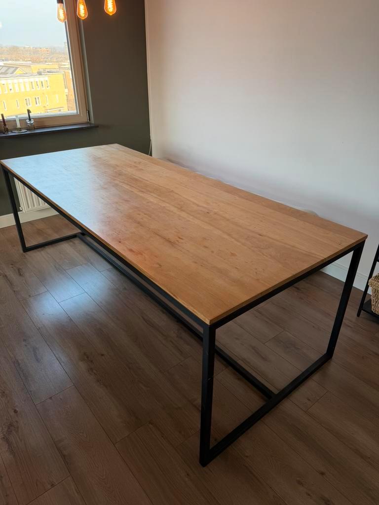 De tafel heeft een prachtig geleefd massief houten blad met een natuurlijke vlam, ondersteund door een stevig, zwart gepoedercoat stalen kokerprofiel. Afmetingen: 230 cm (lengte) x 96 cm (breedte) hoo