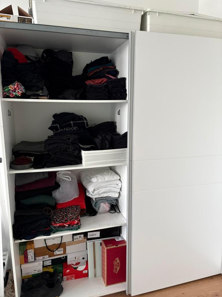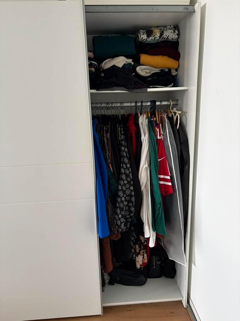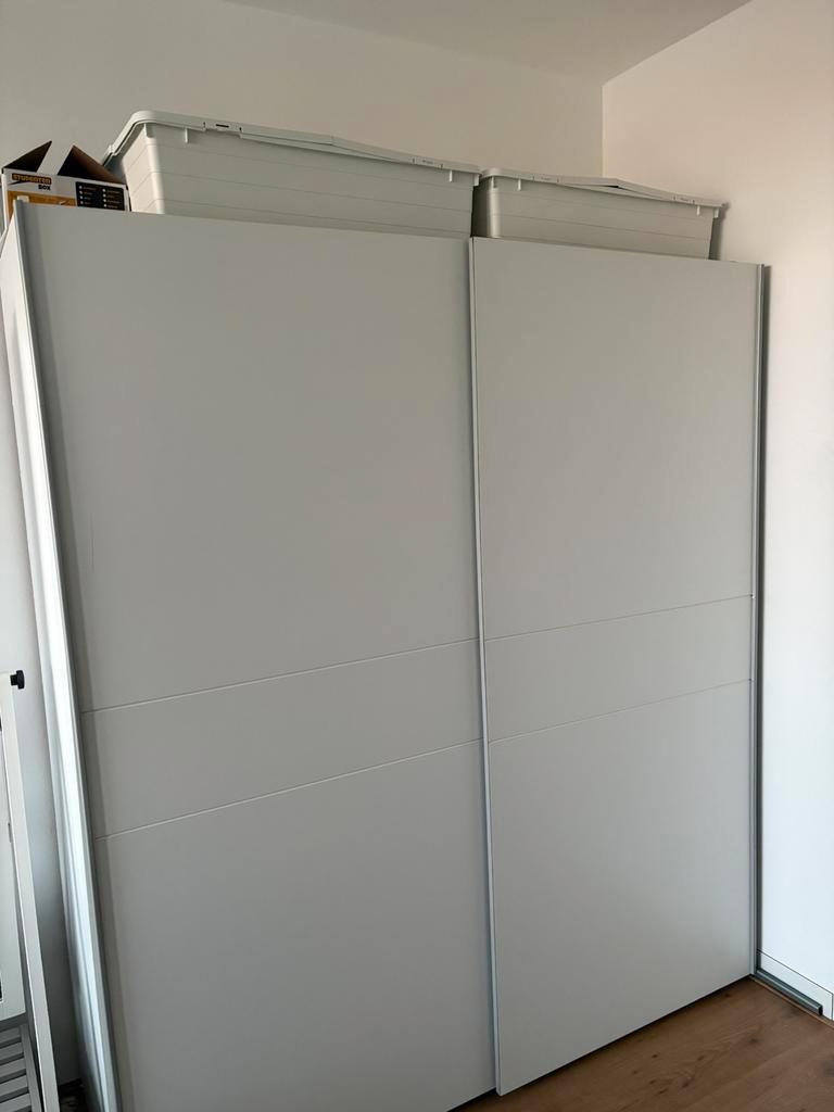 Gratis op te halen: witte kledingkast met schuifdeuren voorzien van grijze details. Het linker deel bestaat uit planken, het rechterdeel heeft een kledingroede en een plank. De kast is enkele jaren ge