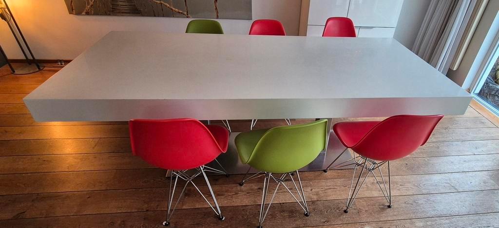 Eetkamertafel (220x100) met 6 stoelen. De set is 15 jaar oud en vertoont gebruikssporen. Nog prima te gebruiken. Alleen af te halen aanstaande dinsdagavond (17-2) ivm levering nieuwe eetkamerset.