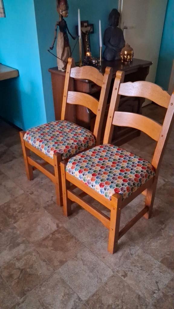 Set van 4 eethoek stoelen. De stoelen hebben een houten frame en een kleurrijke bekleding. Ze zijn in goede staat en comfortabel om op te zitten. Perfect voor de eethoek of keuken. Hoezen van de kusse