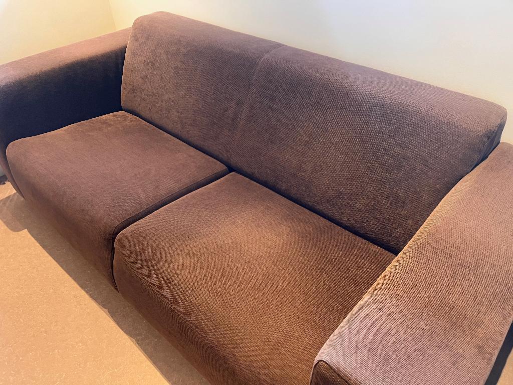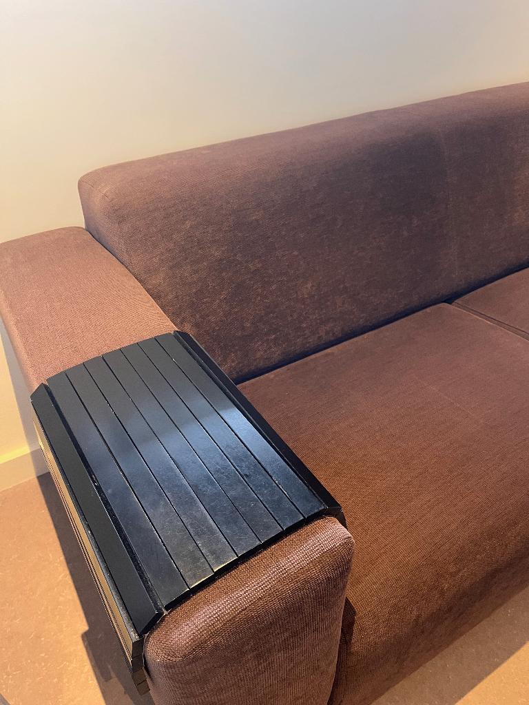 Bruine 2 zits bank in keurige staat. Niet doorgezeten of slijtplekken. Met 2 losse flexibele tafeltjes voor op de leuningen. Lengte van de bank 190 cm, diepte 88 cm, hoogte 80 cm. Bank staat op bruine