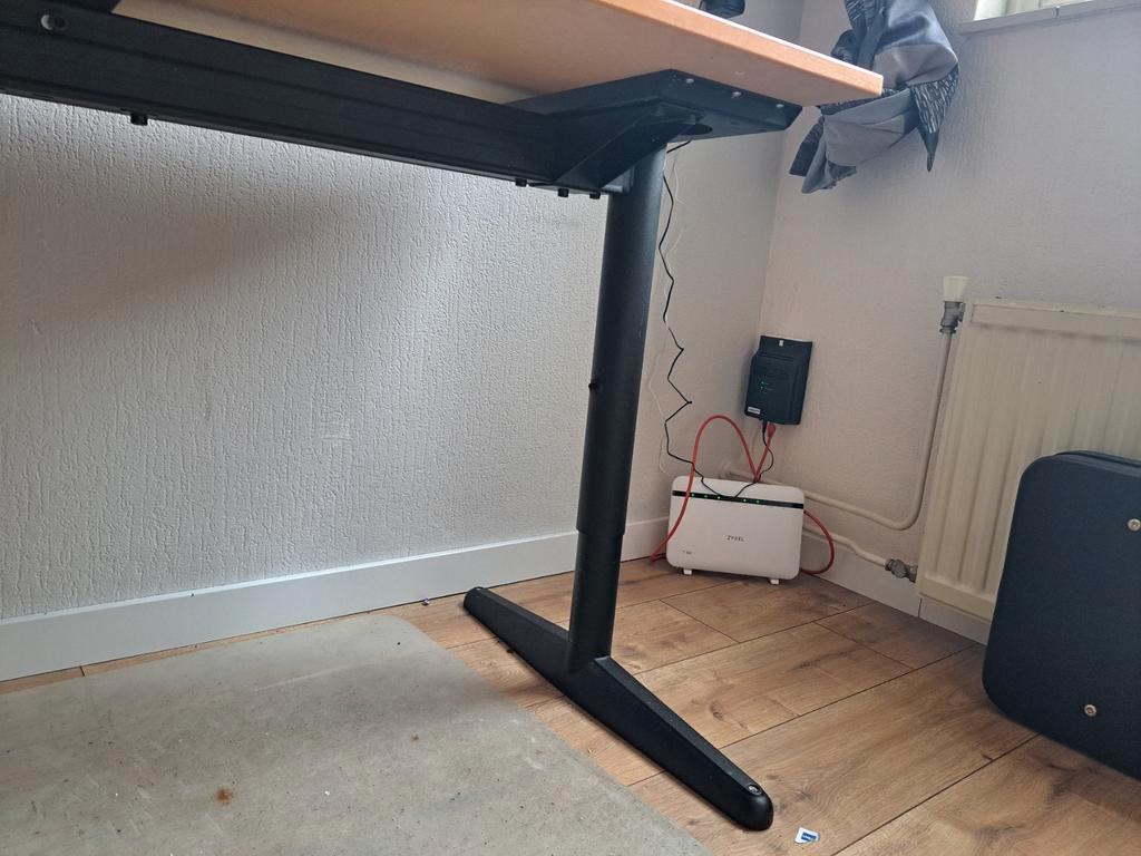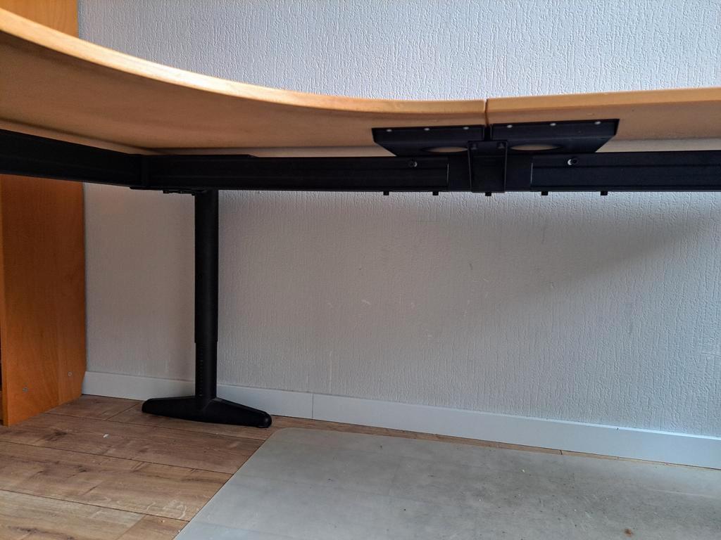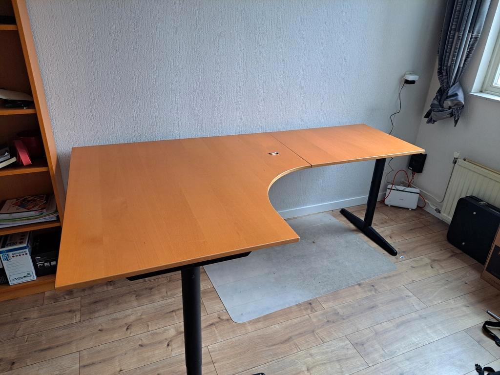 Bureau met in hoogte verstelbaar frame. Gebruikt, met kleine beschadigingen. Hoogte verstelbaar tussen 62cm en 82cm. Bureaublad: breedte: 1m80 , lengte dik stuk 1m20, dun stuk 80cm. Ideaal voor een er
