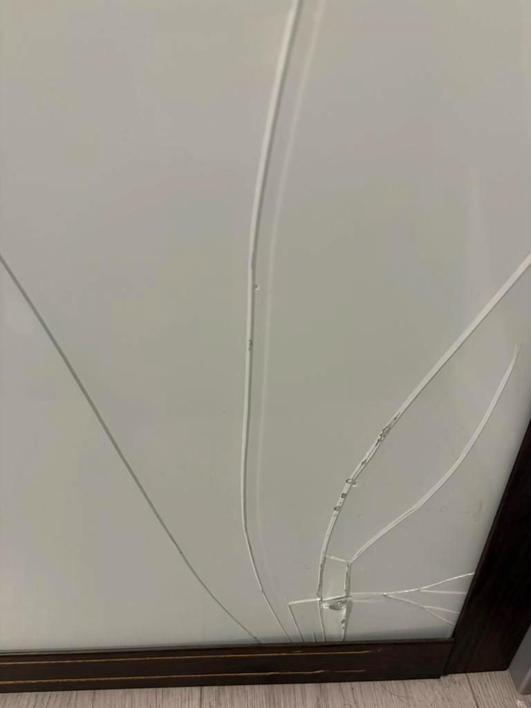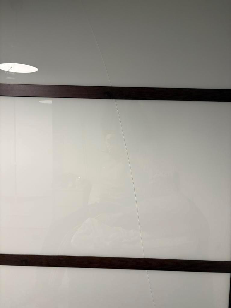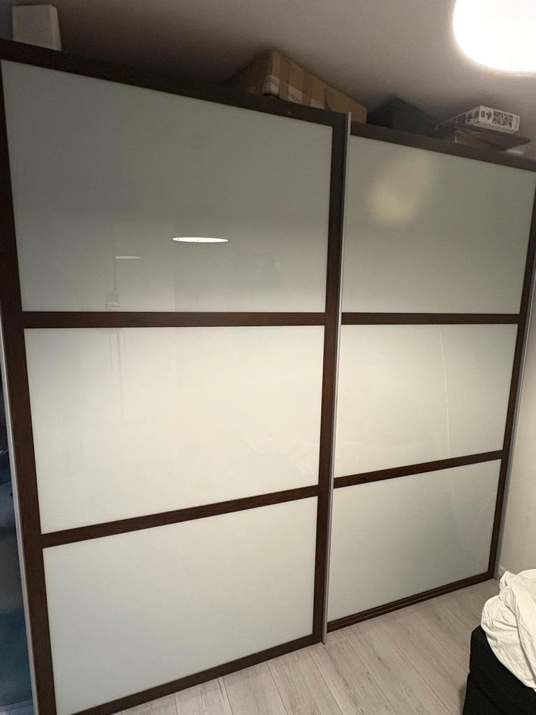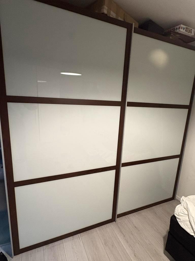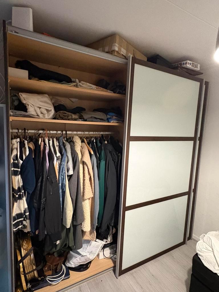 Zelf demonteren. Ruime kledingkast met schuifdeuren. Biedt veel opbergruimte voor kleding en andere spullen. Let op: één van de glazen deuren is beschadigd (zie foto).