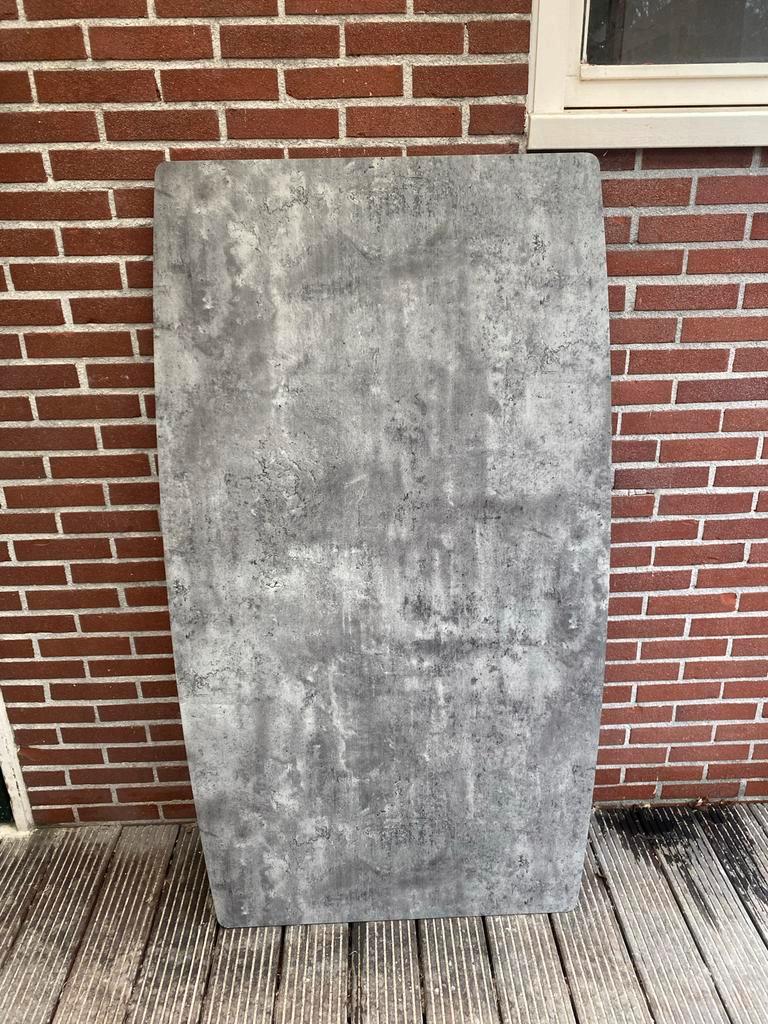 Stijlvolle en nette eettafel met een uniek betonlook tafelblad en stevige metalen poten. De tafel biedt ruimte voor 4-6 personen. De schroeven zijn we helaas kwijt geraakt. Daarom gratis op te halen.