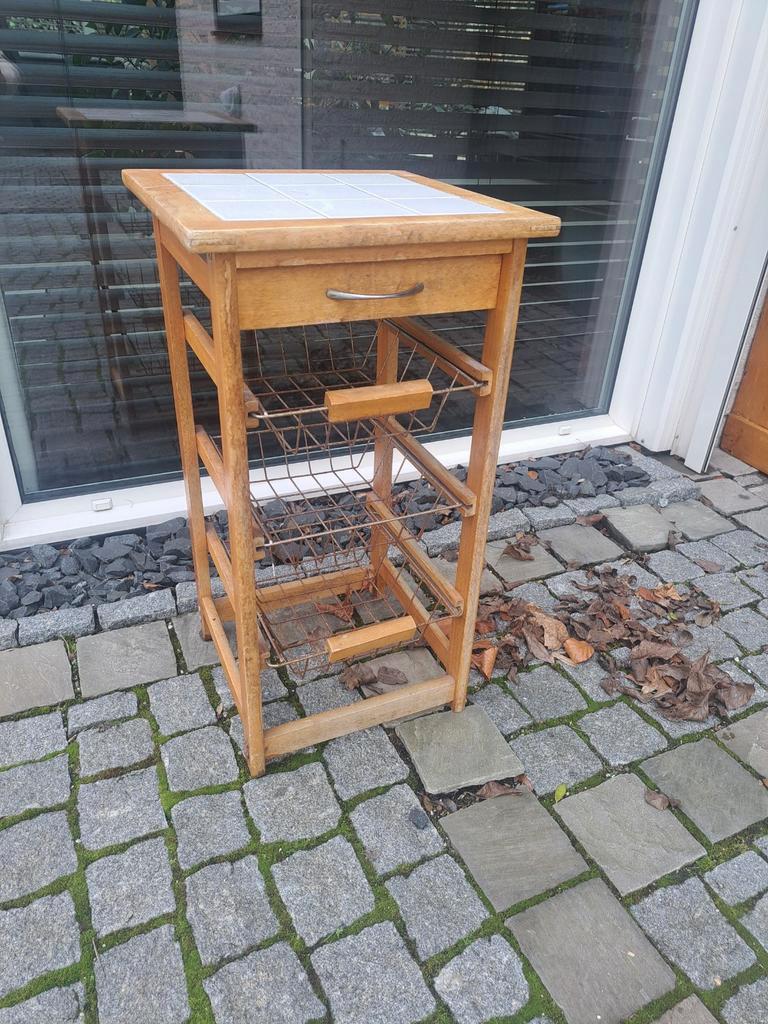 Leuke houten bijzettafel met een betegeld blad en een handige lade, werkt niet optimaal. De tafel heeft ook metalen manden, zijn verroest voor extra opbergruimte. Gebruikt, heeft buiten onder overkapp