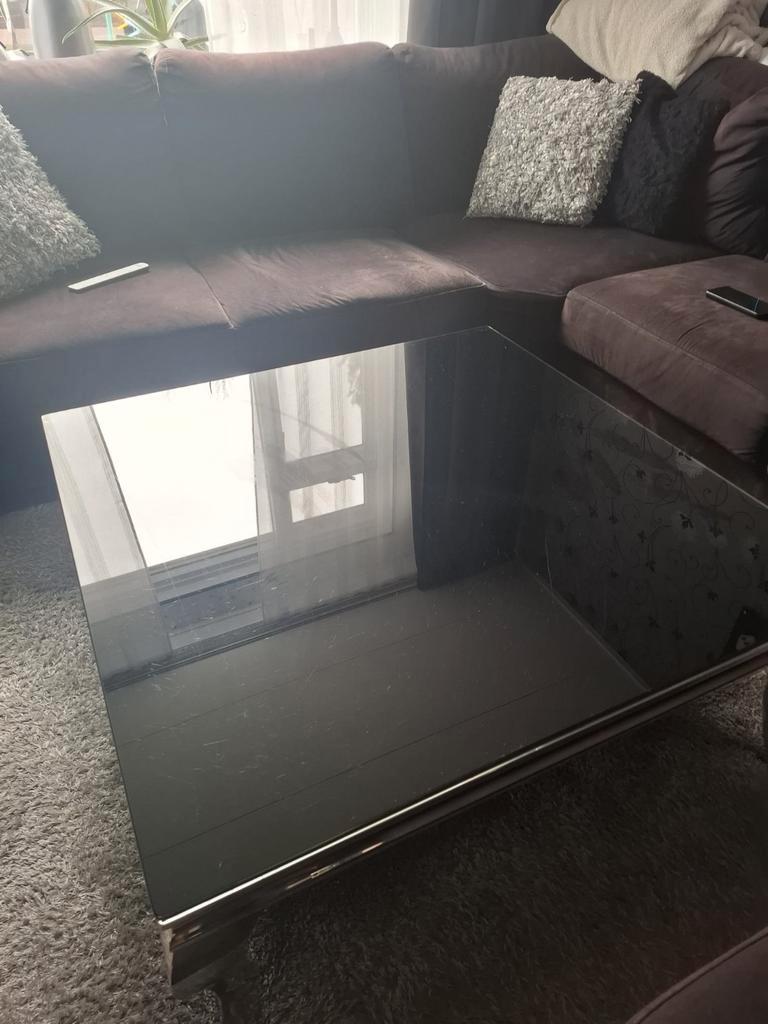 Mooie salontafel. Zilveren basis met zwartglazen plaat erop. Is gebruikt maar kan zeker nog een ronde mee. Let op is een grote salontafel van 100cm bij 100cm en 40cm hoog. Dit in verband met vervoer.