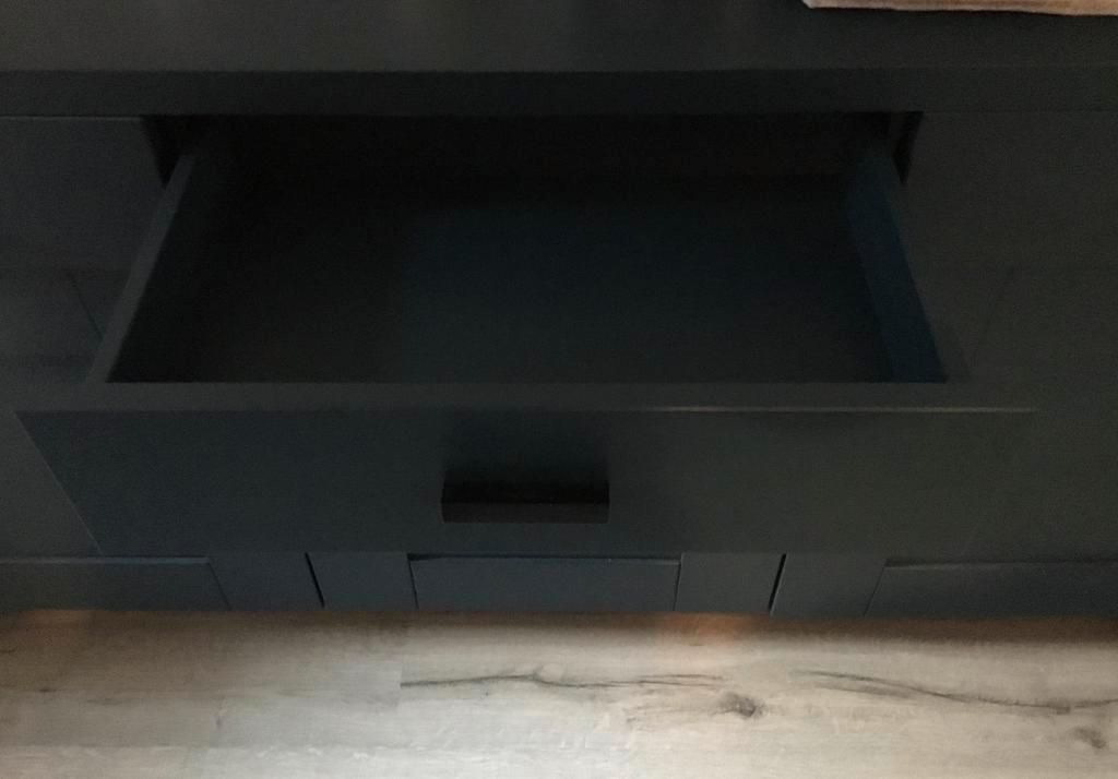 Houten dressoir kast met 3 lades en 3 vakken met deurtjes, blauw geverfd. Afmetingen 200x45x94 cm.