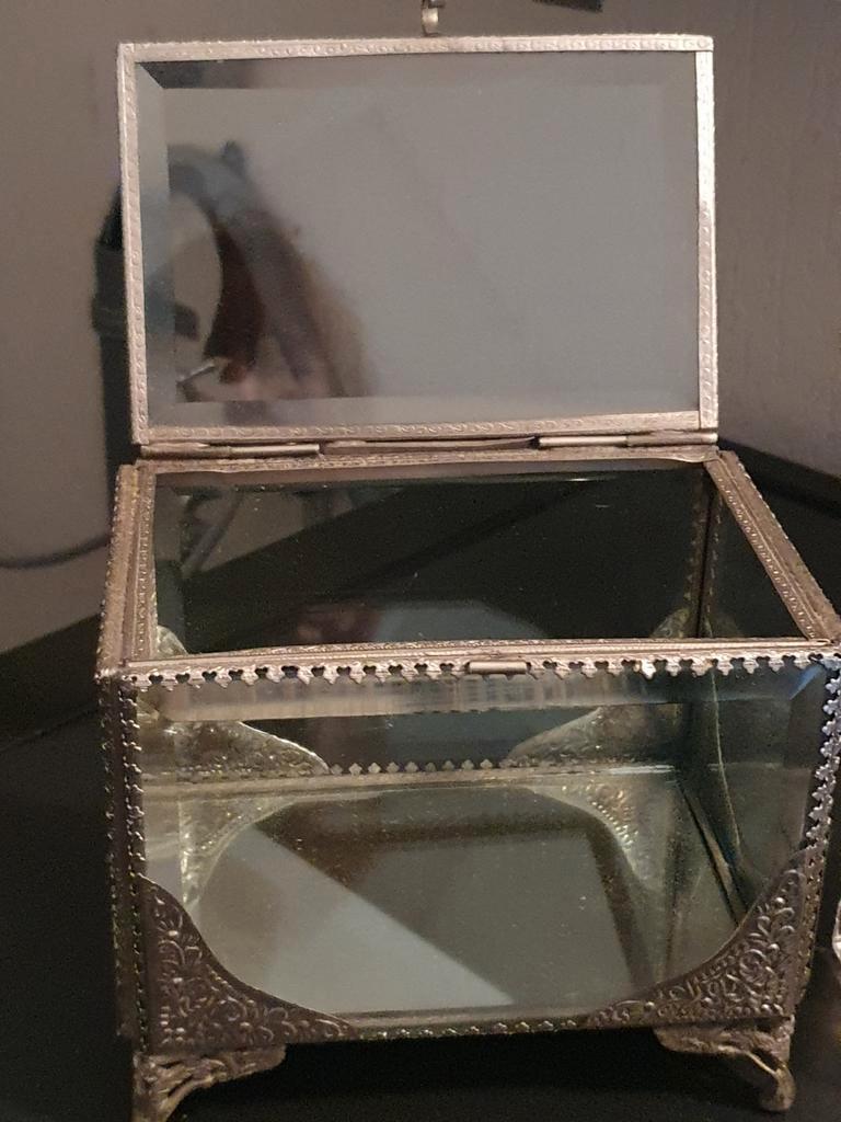 Gratis afhalen; 4 glazen waxinelichten, 1 bloemenstolp ook te gebruiken als windlicht, en een leuk versierd glazen kistje met bodem van spiegelglas.