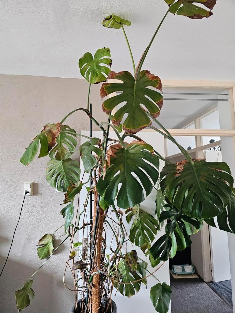 Een grote monstera deliciosa, ook wel bekend als gatenplant, in een mooie sierpot. De plant is ongeveer 150-200 cm hoog. De plant heeft halfschaduw nodig. Let op: sommige bladeren hebben bruine randen