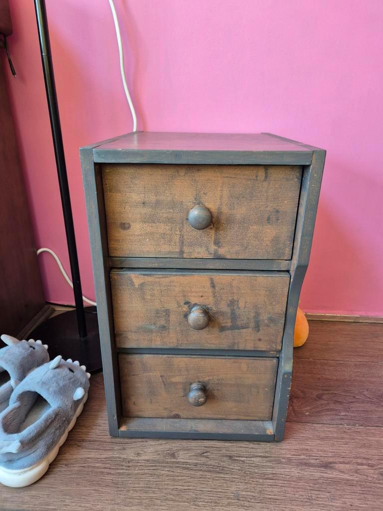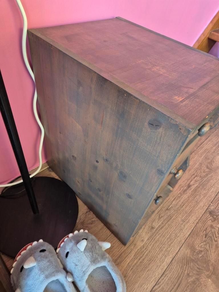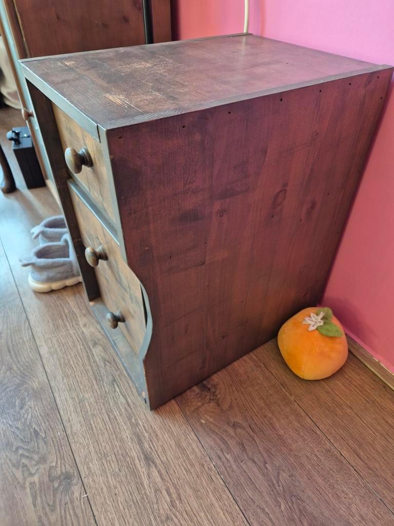 Klein houten ladekastje met afmetingen 32 cm breed, 33 cm diep en 53 cm hoog. Ideaal als nachtkastje of bijzettafeltje. Heeft lades voor extra opbergruimte.