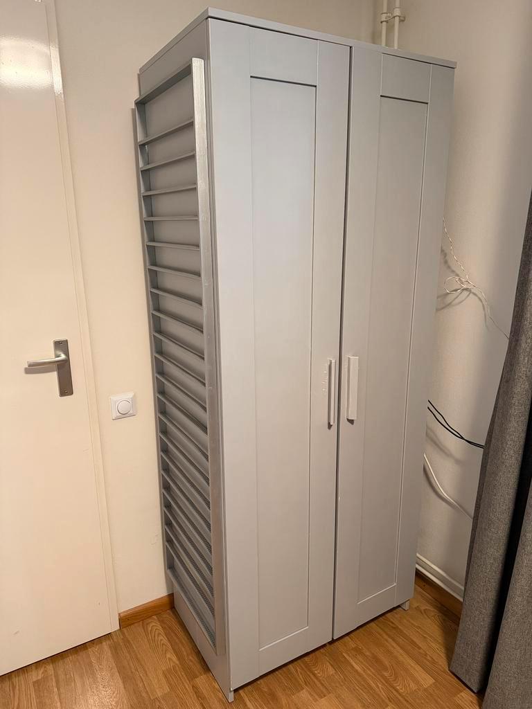 Gratis ophalen (voor wie het eerst komt….) Kast is al gedemonteerd. Licht grijs geschilderde kledingkast. 78X50x190 verf is er op sommige plekke afgesleten, zie foto. Aan zijkant is een rekje gemaakt