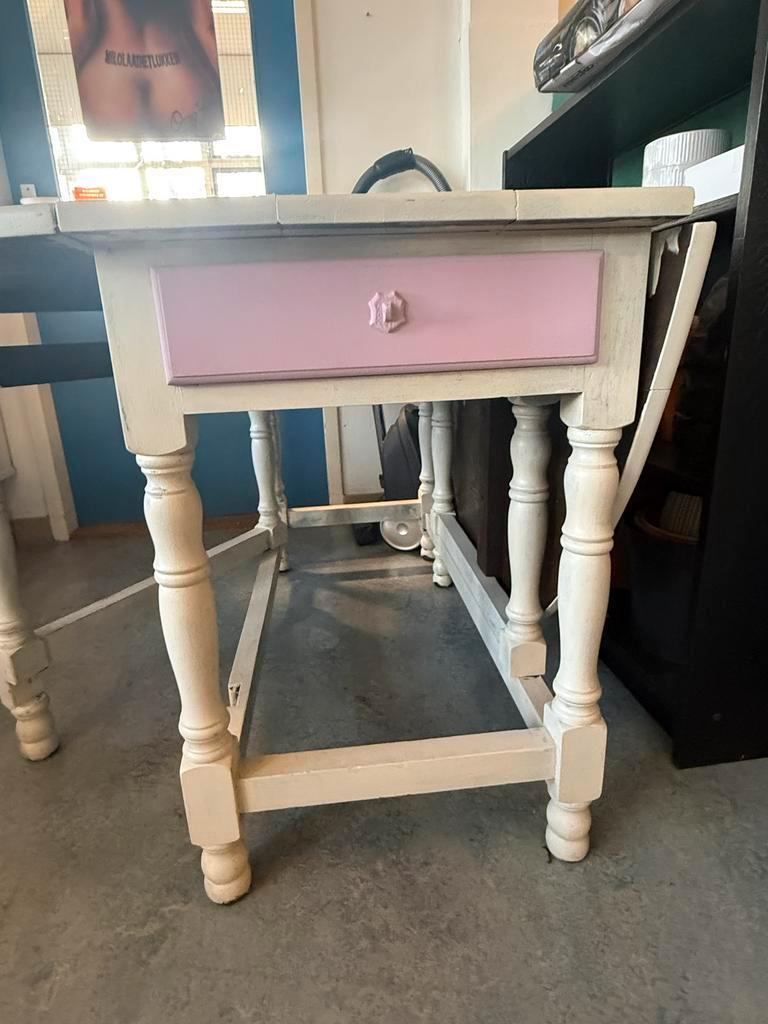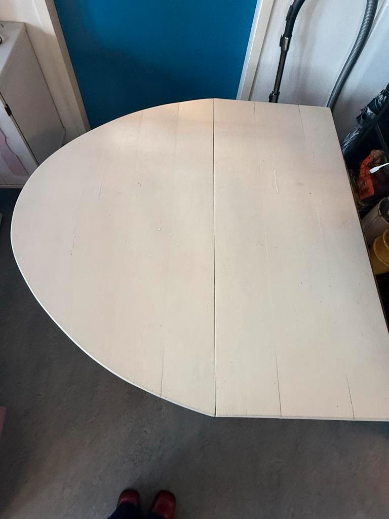 Houten eettafel. Uitklapbaar aan beide kanten. Rond tafelblad. Moet even geschuurd en geverfd worden, maar nog helemaal goede tafel. Gratis op te halen.
