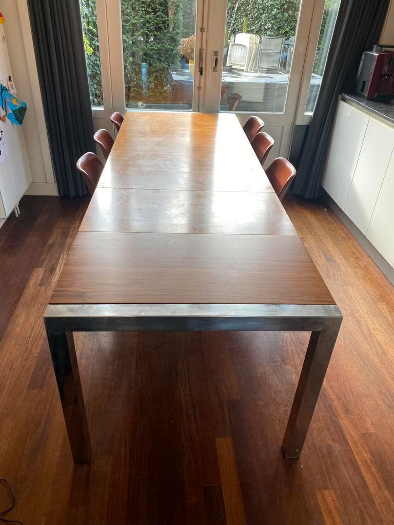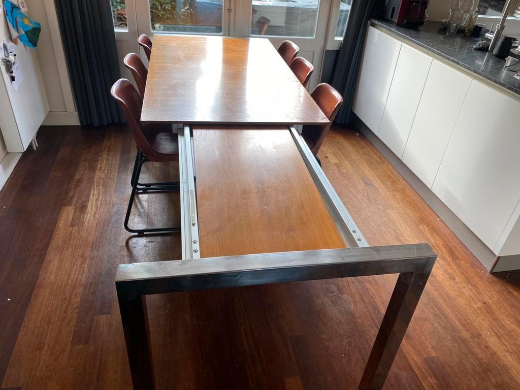 Wie kan ik blij maken met deze mooie tafel? Het heeft misschien wat liefde nodig maar het is nog een prima tafel. 90Cm breed 74cm hoog 170cm lang. (Met 2 losse stukken, die je onder het blad kunt opbe