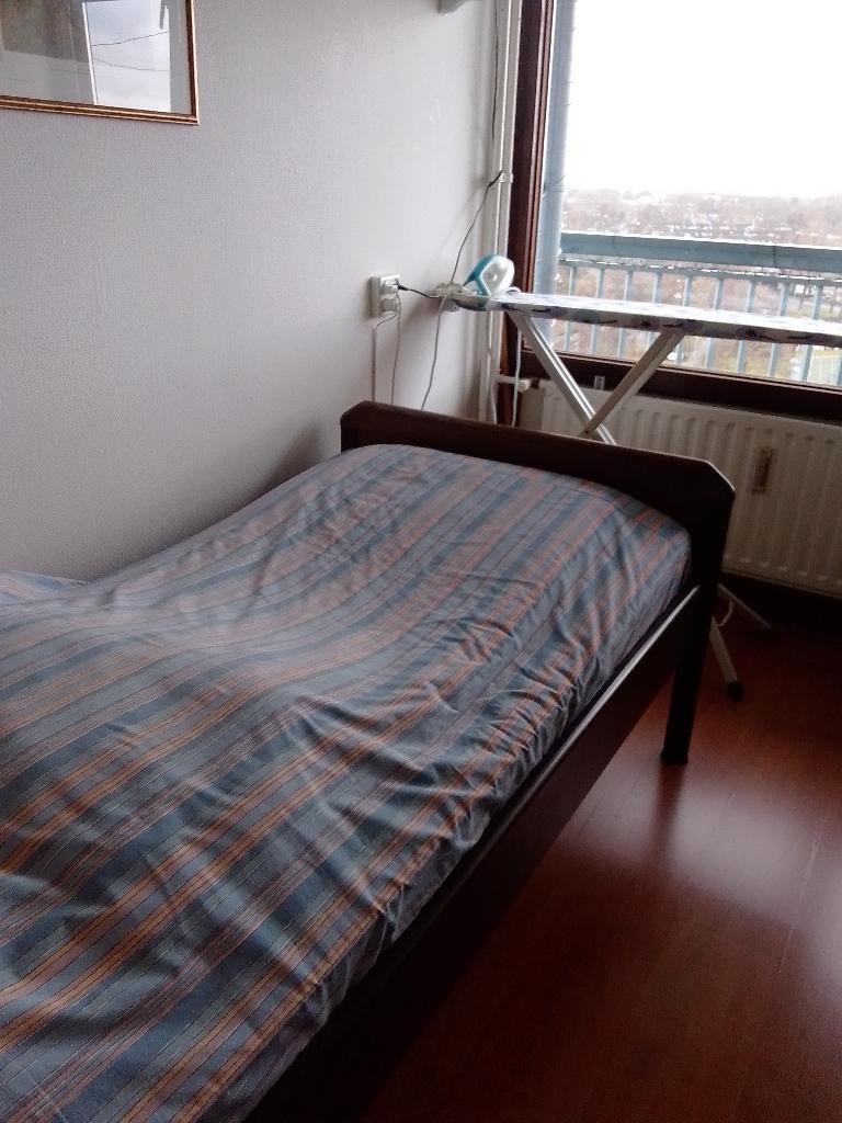 Afmetingen l x b x h 200 x 100 x (84 hoofdeinde x 73 voeteinde) maten in centimeters. Geheel compleet betreffende: lattenbodem, auping matras, kussens en beddengoed. Gratis afhalen, maar wel met twee