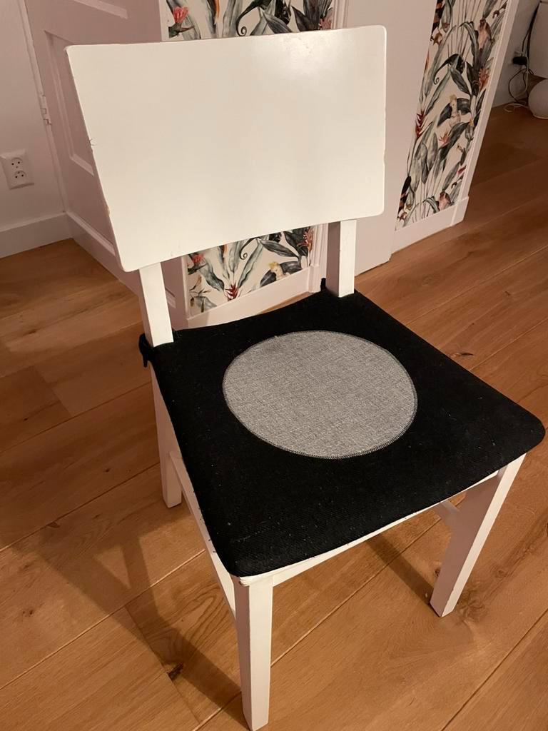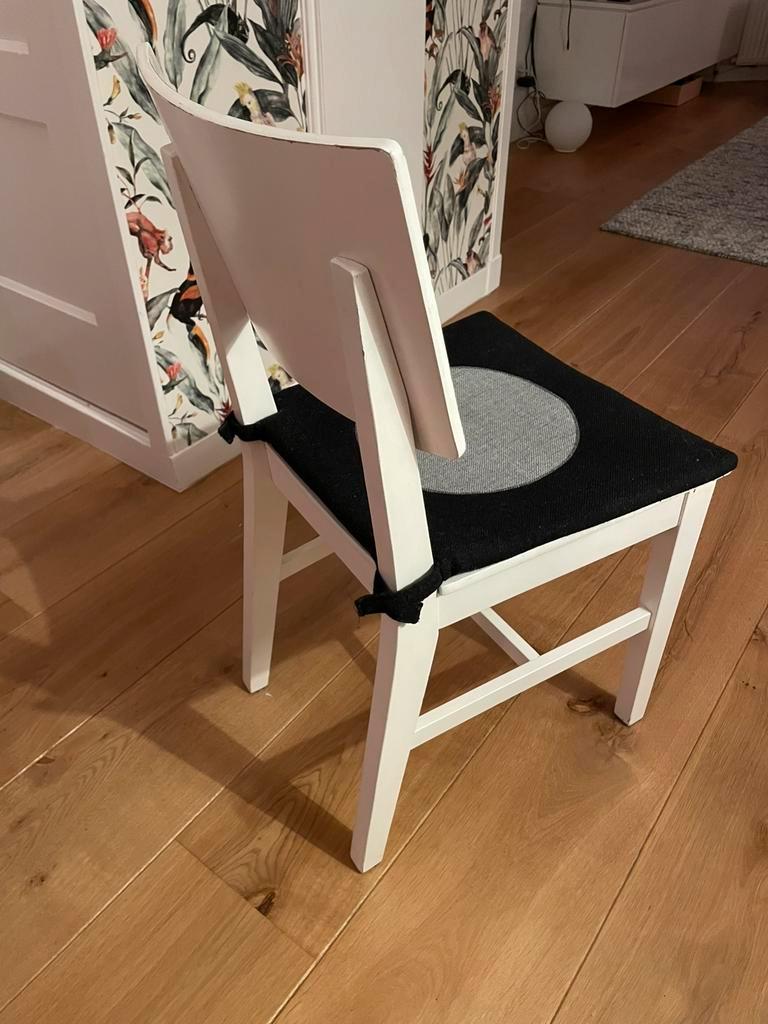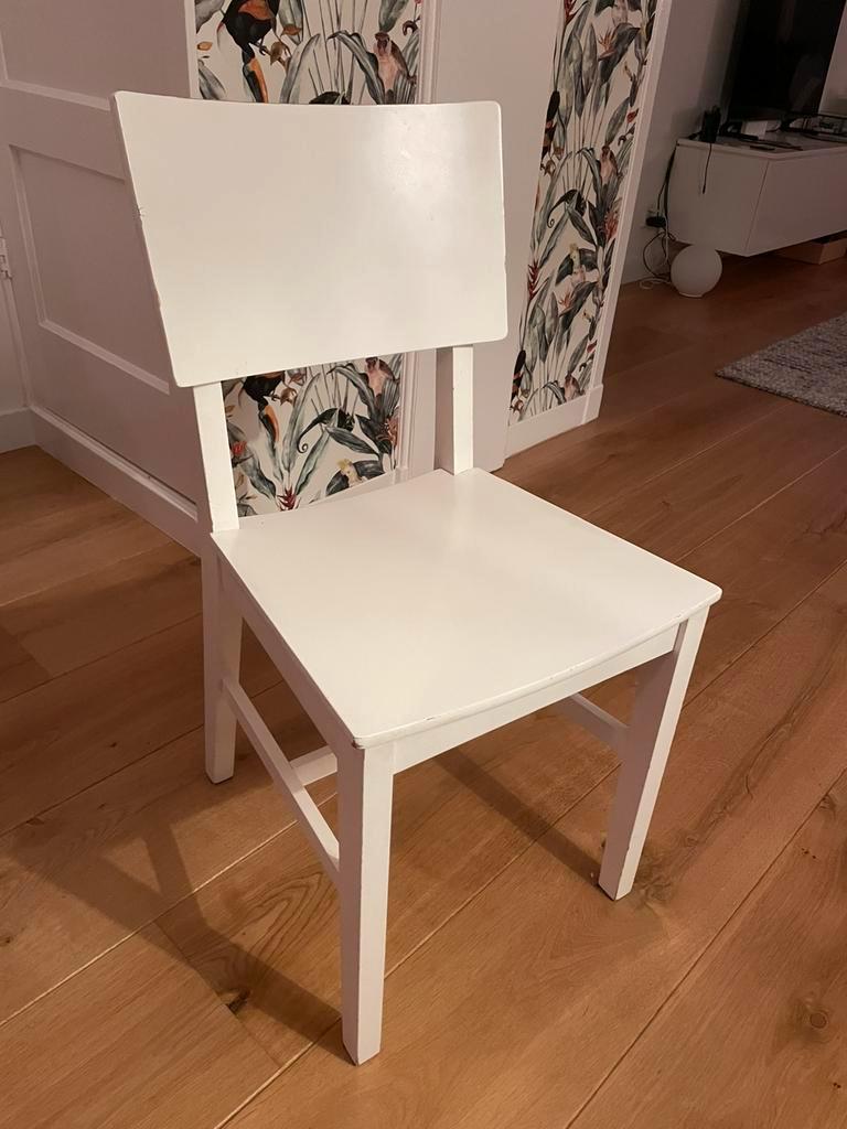 6 witte eettafel stoelen. Bij de randen is de verf wat beschadigd. Van 1 stoel zit de rugleuning wat los. Je kan er nog wel prima op zitten.