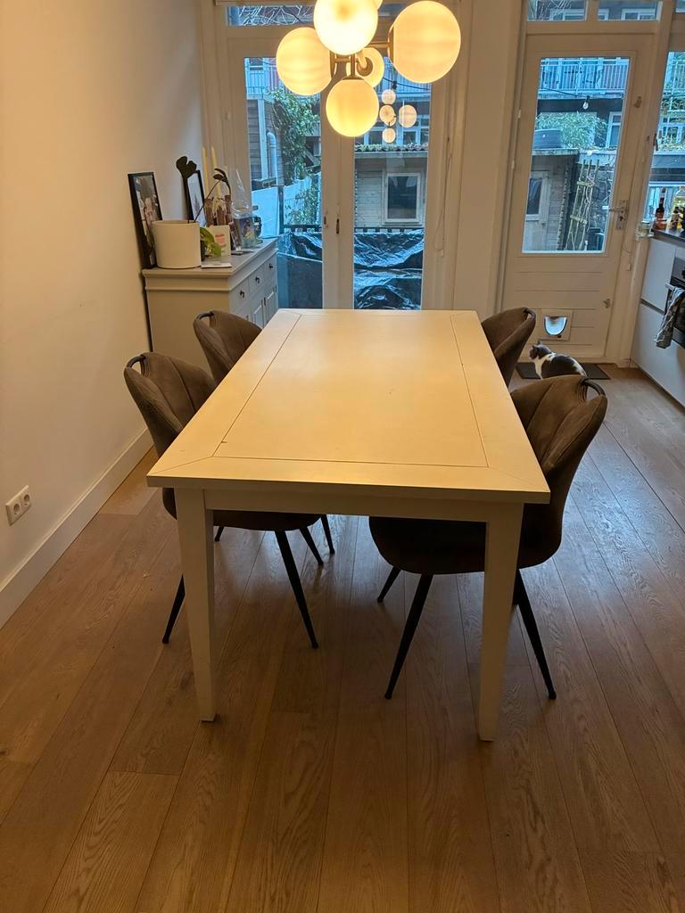 Witte eettafel zonder stoelen 180 x 90 cm onderstel en rand massief, middenblad niet ivm gewicht blad heeft wat vlekken e.d. Maar met licht opschuren en een likje verf is hij weer als nieuw. Zo hebben