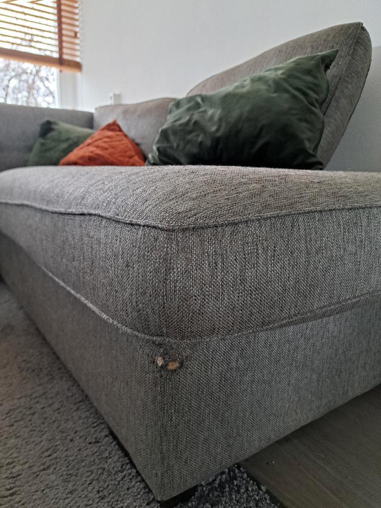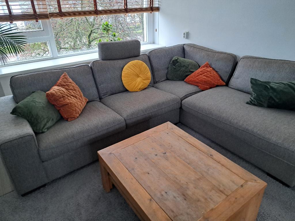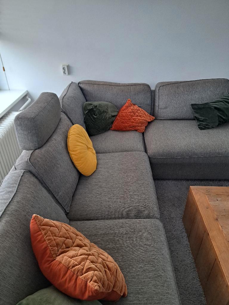 Ruime hoekbank, grijs van kleur. Een heerlijke bank om op te ploffen na een dag werken. Lekker diepe zitoppervlakte en fijne kussens. Diepte: 95 cm (incl rugkussens) afmeting: 275x230 cm excl. Sierkus