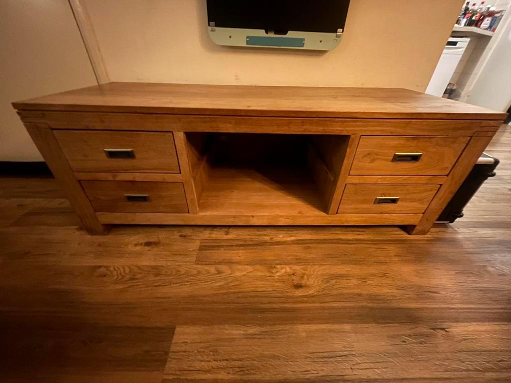 Voor de starter met een low budget.netjes onderhouden tv meubel met bijpassende salontafel en een bijpassende eettafel. (3Delig setje).gaat alleen als setje weg.