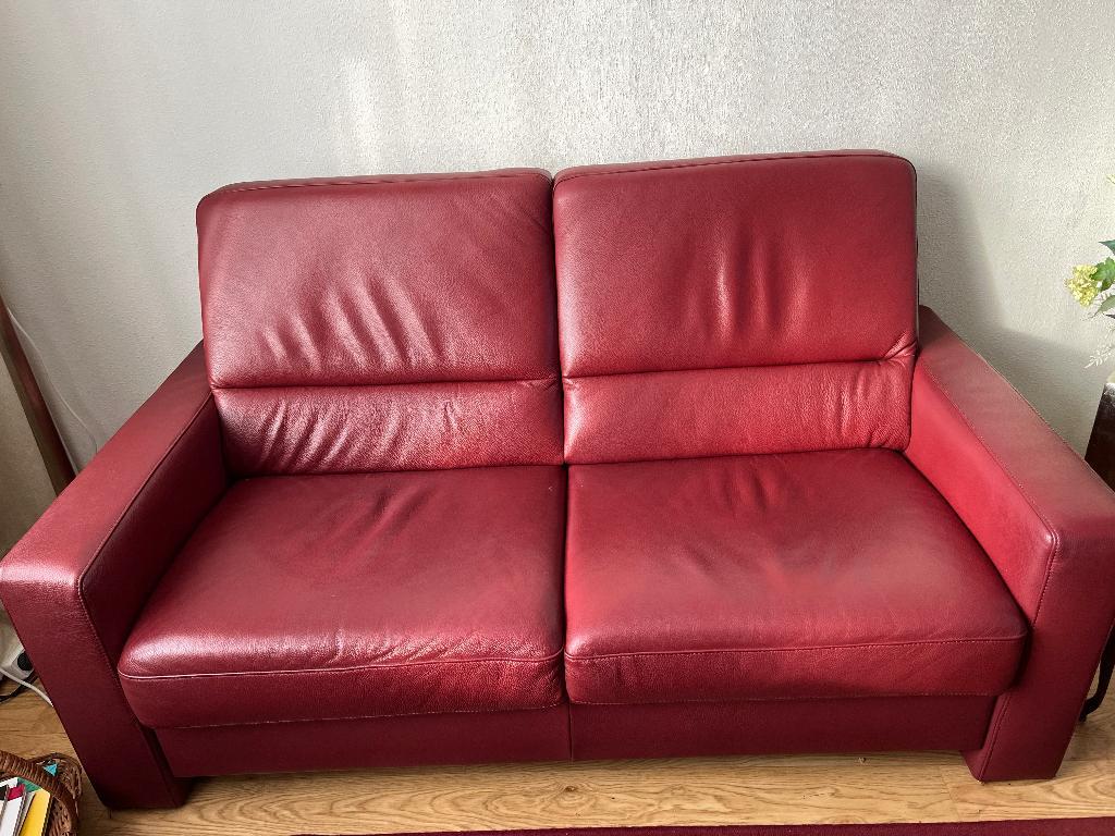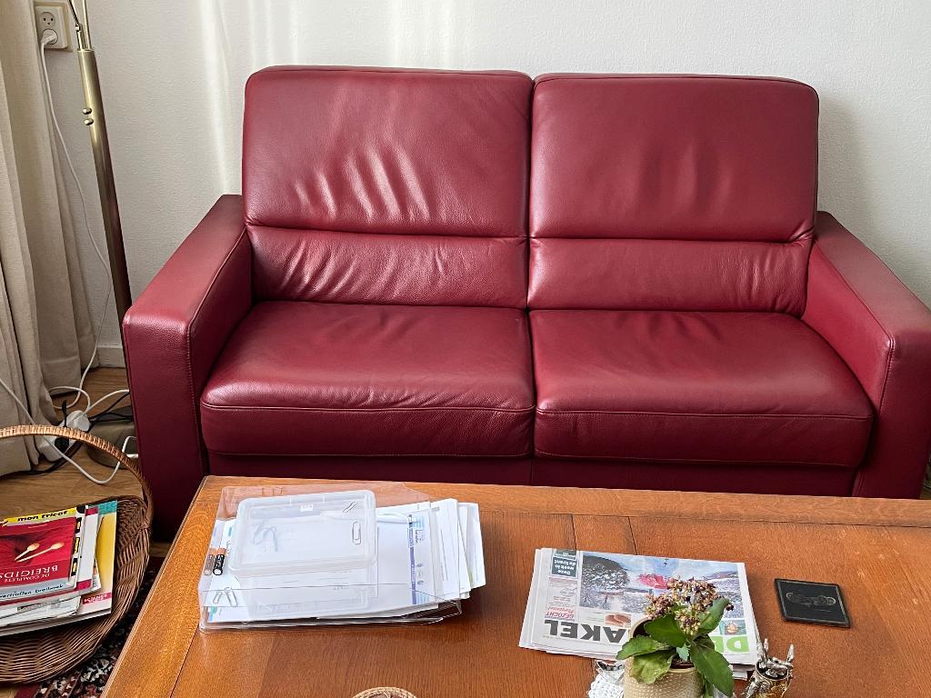 Donkerrood leren bankje. Haast nieuw, wegens omstandigheden moet ‘ie weg. Heb ook nog een donkerblauwe leren sta-op-stoel (fauteuil0 die weg mag. Wel snel, want anders gaat alles naar het grofvuil.