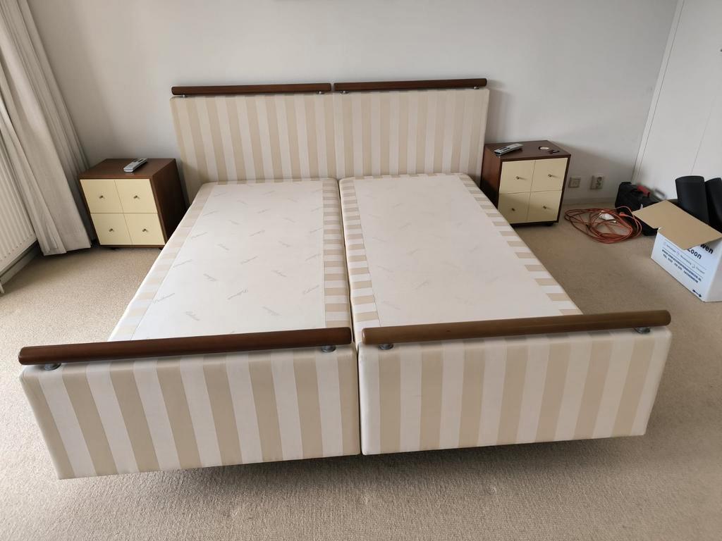 Mooi tweepersoonsbed van het merk pulman, inclusief bijpassende nachtkastjes. Let op: de matrassen zijn niet inbegrepen. Het bed is in goede staat en biedt een comfortabele slaapoplossing. De nachtkas