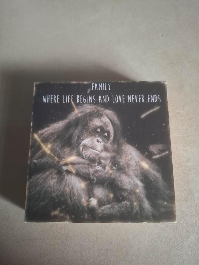 Blokje met de afbeelding van apen met de tekst, spreuk ''where life begins and love never ends'' de afmeting is 10 x 10 cm in prima staat gratis ophalen!