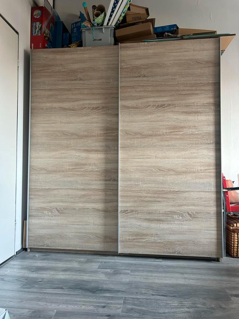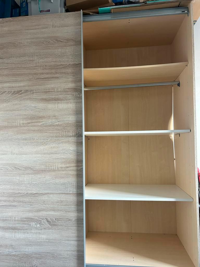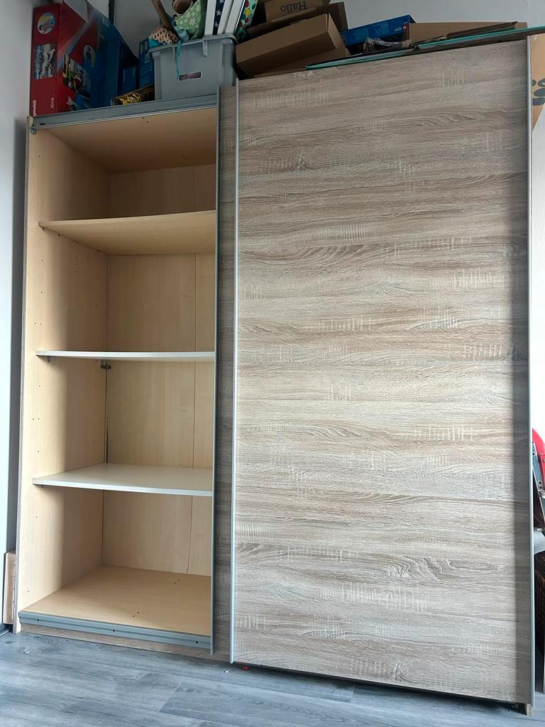 Gebruikte schuifdeurkast met planken en mogelijkheid tot een hanggedeelte. De kast is 180 cm breed en 197 cm hoog. Ideaal voor extra opbergruimte. De kast is in gebruikte staat en kan aan de binnenkan