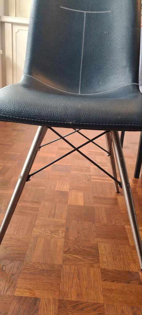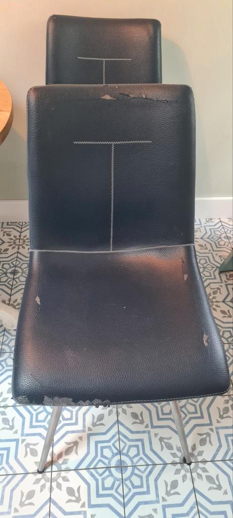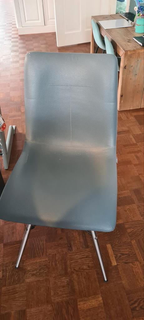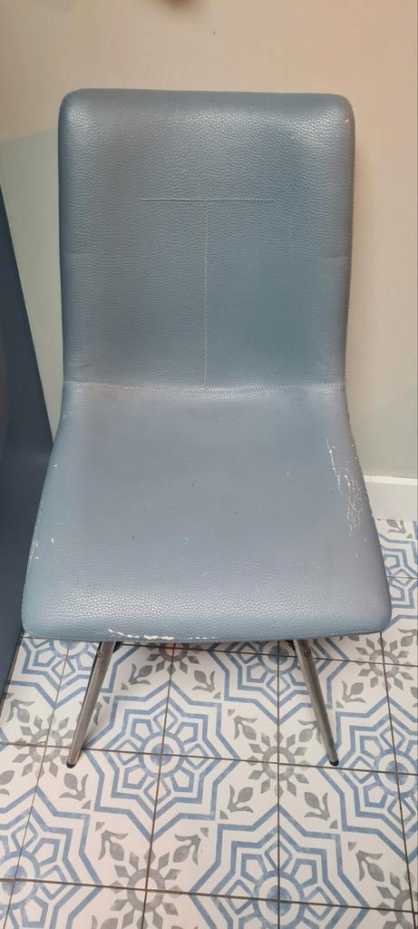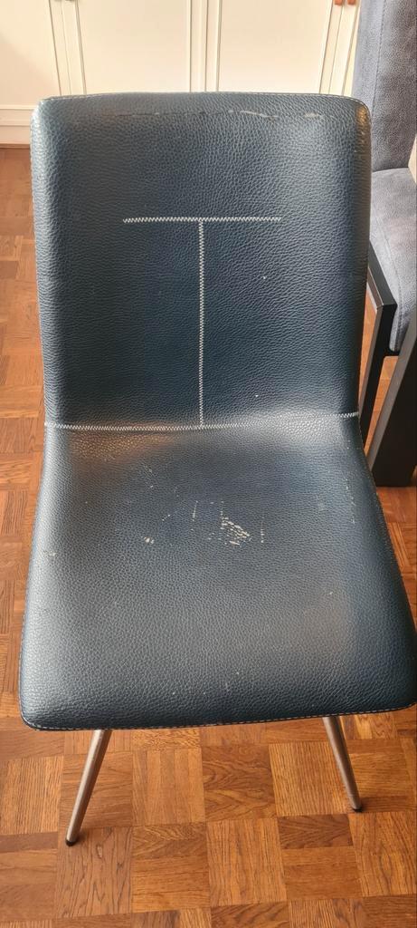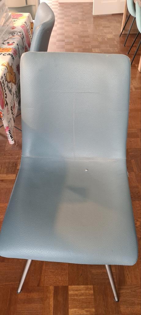 6 eetkamerstoelen xooon kunstleer met roestvrijstalen frame. 3 Donkerblauw en 3 lichtblauw. Allen kunstleer beschadigd zoals op foto''s te zien. 3 Nu beschikbaar, andere 3 later (datum onbekend) af