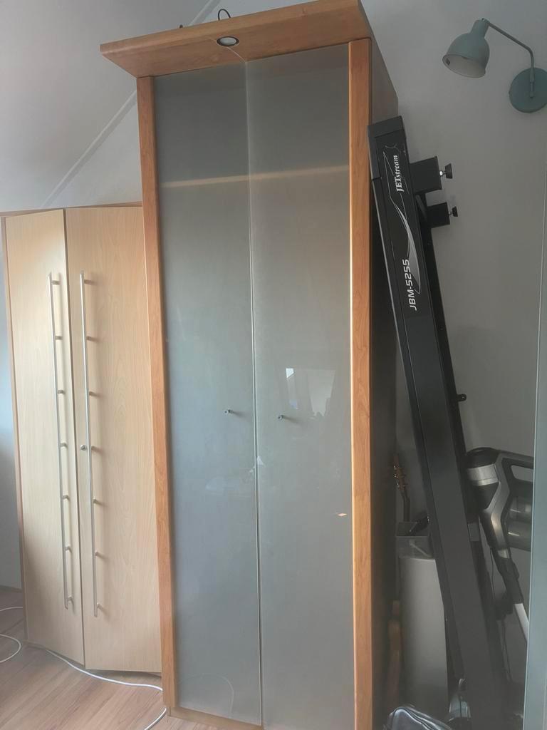 Ikea askedal kast met melkglazen deuren. De kast is 80cm breed en 237cm hoog. Er is een kleine beschadiging bij de spot. Verder in goede staat.