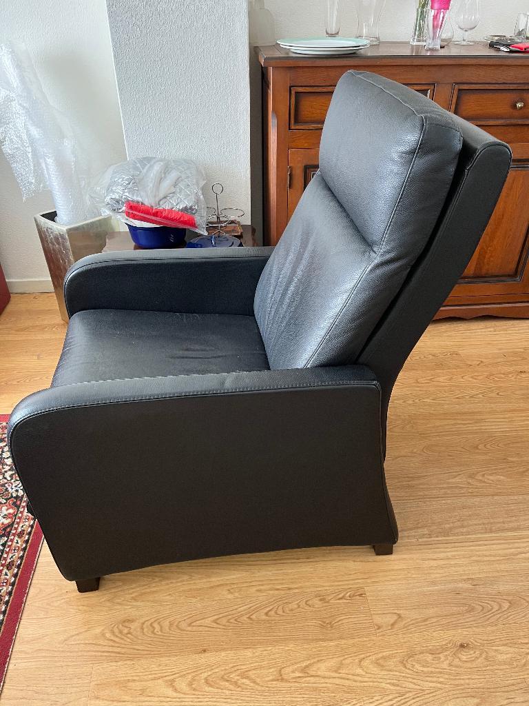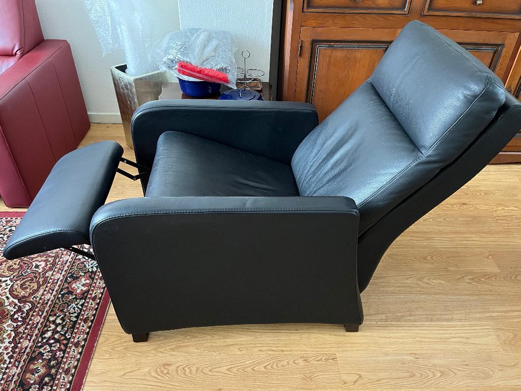 Mooie, haast nieuwe donkerblauw leren sta-op-stoel. Gratis af te halen. Moet wegens omstandigheden snel opgehaald worden. Huis moet leeggeruimd worden ivm nieuwe huurders. Dus haast is geboden. Er is