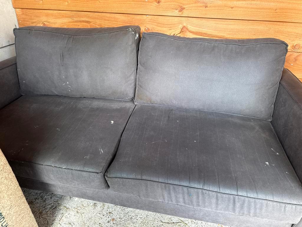 Deze 3-zitsbank staat buiten en heeft daardoor wat vlekken. De vlekken kunnen er waarschijnlijk wel uit. De bank zelf is in goede staat en kan met een beetje aandacht weer helemaal schoon worden.