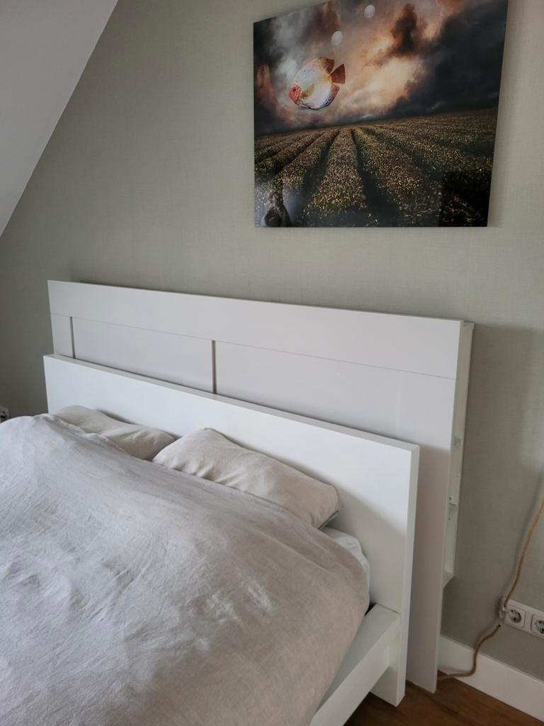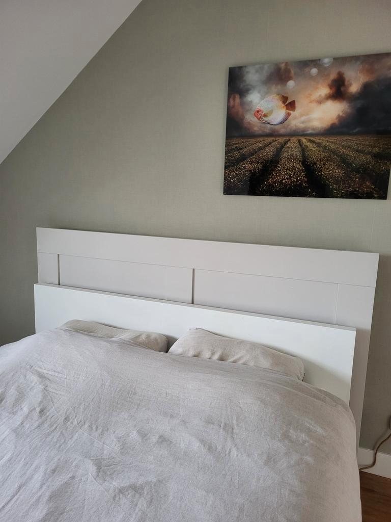 Hoofdbord. Ooit bij de ikea gekocht en zelf ondieper gemaakt. Als je het bed er tegenaan schuift, staat ie strak tegen de muur. Vandaag of morgen ophalen! Maten: 186x110x11 cm. Kleur: geverfd in licht