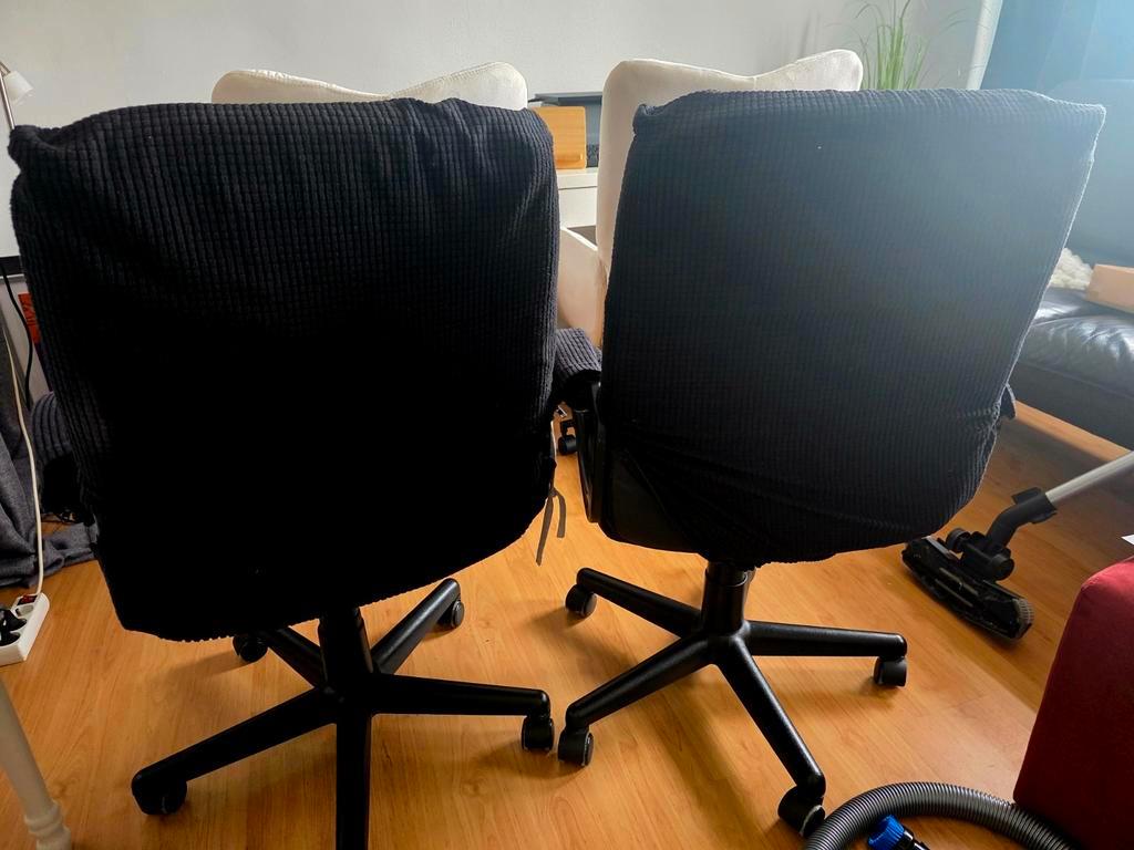 Twee in hoogte verstelbare bureaustoelen. De bekleding van de stoelen is kapot/versleten, daarom zijn ze voorzien van mooie, stoffen wasbare hoezen, inclusief de armleuningen. Hierdoor kunnen ze nog p