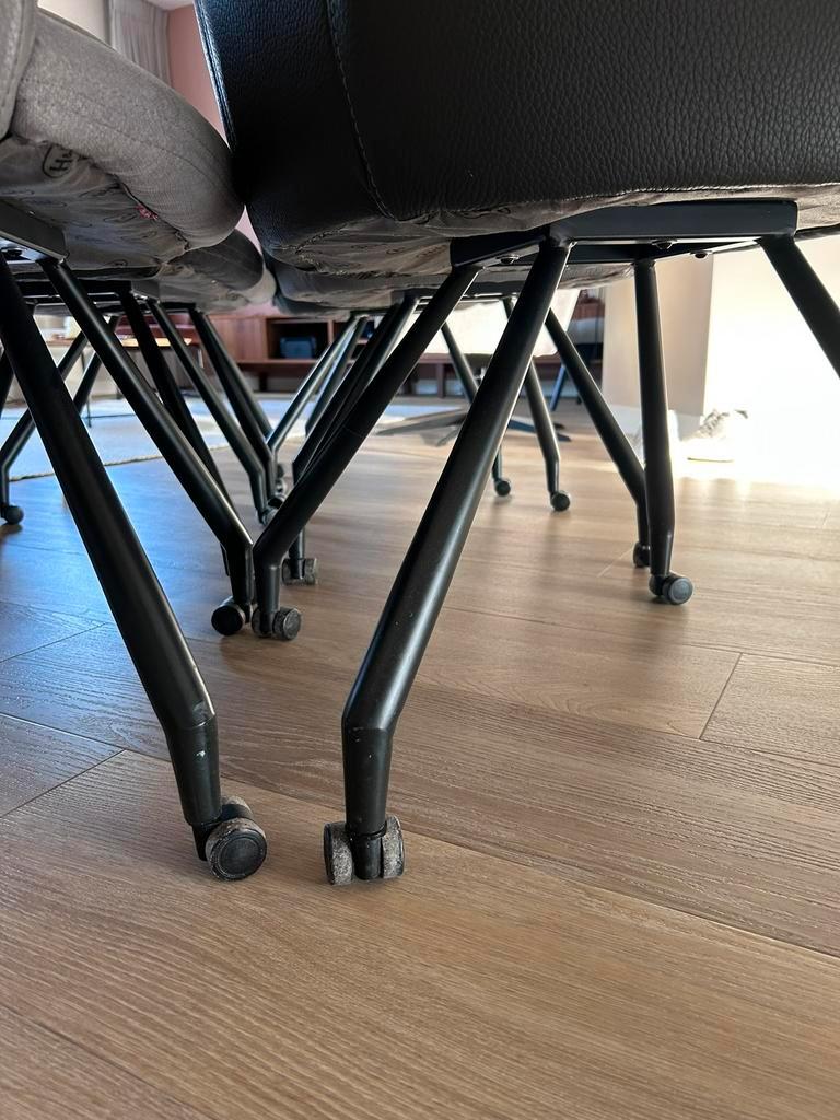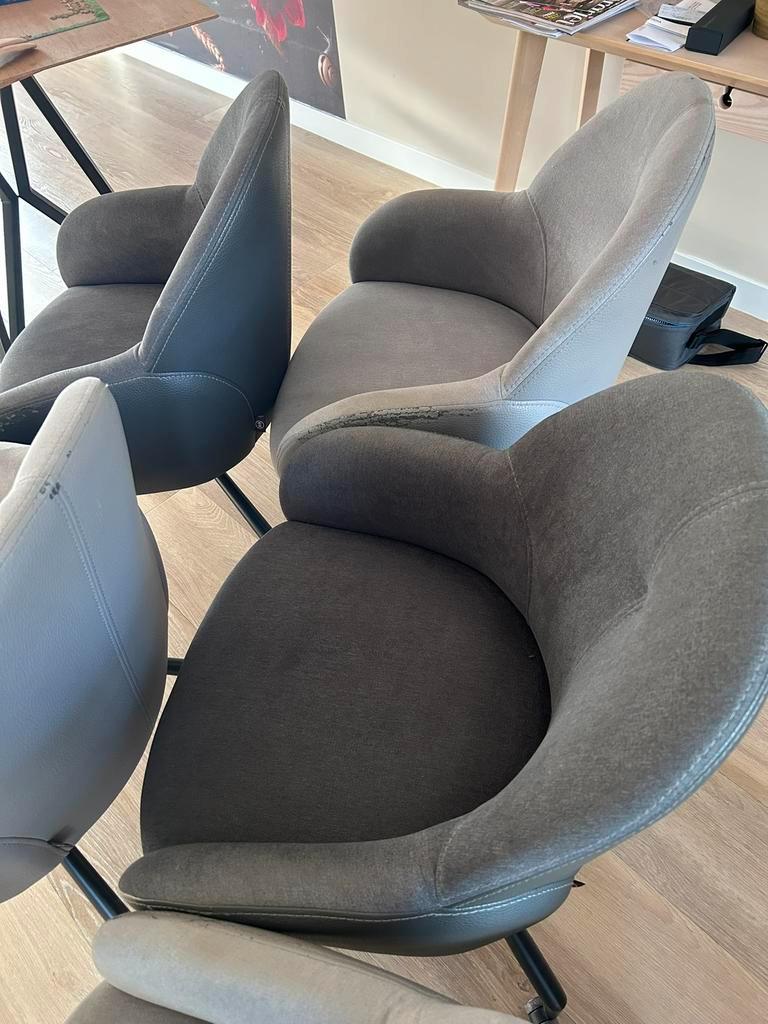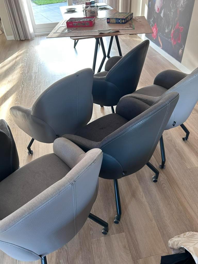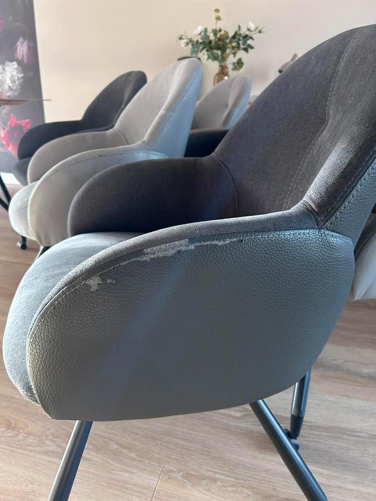 Bij deze verkoop ik 6 eetkamer stoelen van het merk henders & hazel. Het gaat om 3 licht grijze stoelen en 3 donker grijze stoelen. Op de zijkanten zijn wat beschadigingen in het leer zoals op de