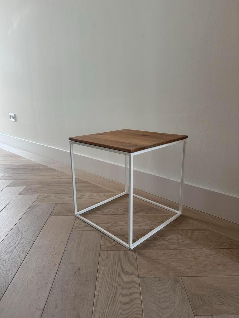 Mooie, compacte bijzettafel met een vierkant eikenhouten blad en een stevig metalen frame. Afmetingen: 35 x 35 x 36 cm. Perfect als decoratief element of handige plek voor je spullen naast de bank of