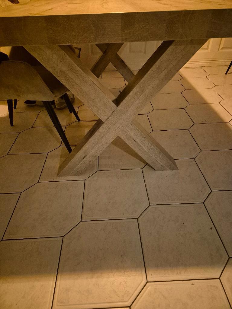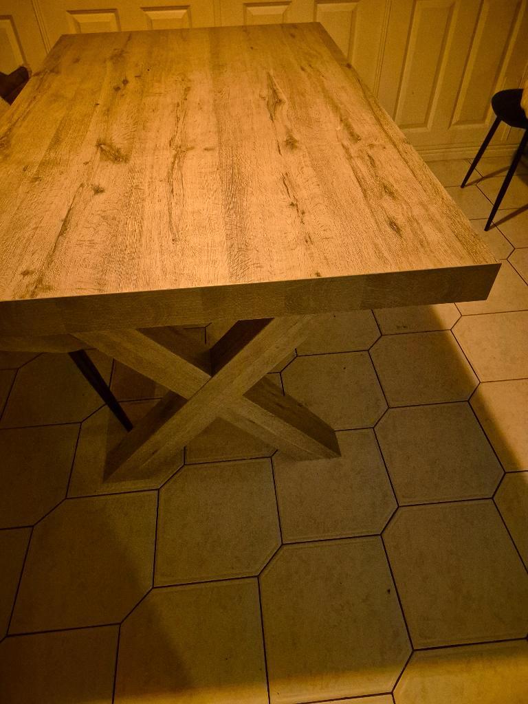 Mooie houten eettafel met enkele gebruikssporen. Sterk en robuust. Afmetingen 164cm x 101cm x 78cm.