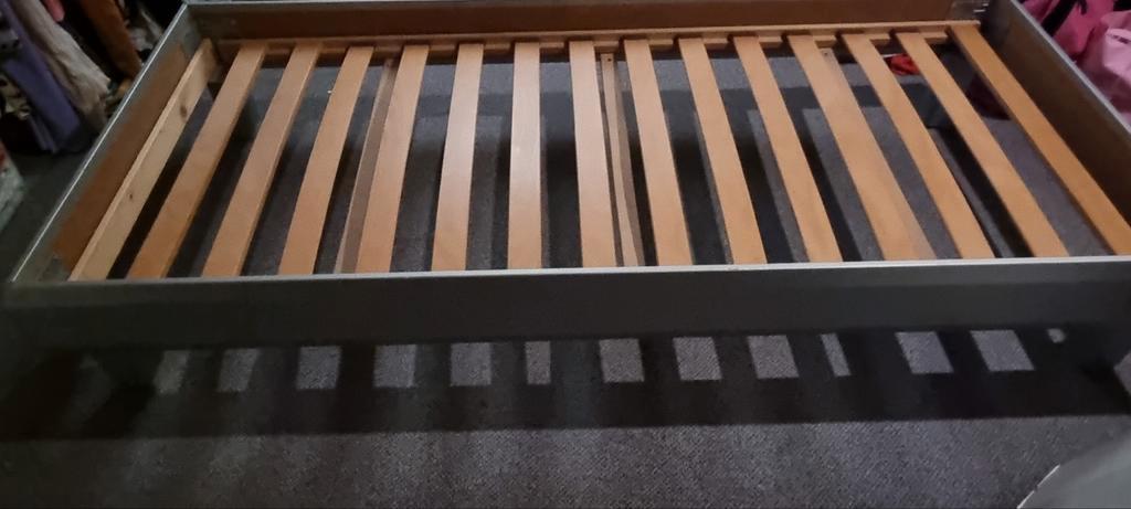 1 persoons bed met lattenbodem. Matras mag je erbij hebben, is niet meer de nieuwste. Staat beide al een tijdje op zolder. Mag meteen opgehaald worden.